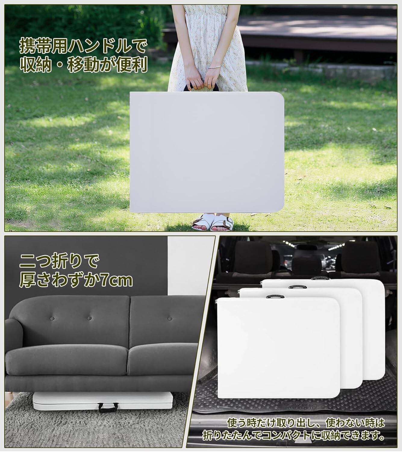 【組立不要】完成品で、面倒な組み立て不要ですぐに広げて使えます!使わない時は薄い板に折りたたんでどこでもスッキリ収納できます。◆【二つ折りで厚さわずか7cm】 使う時だけ取り出し、使わない時は折りたたんでコンパクトに収納できます。取っ手付きで持ち運びもやすいです。お手入れが簡単、水や汚れがついてもサッと拭くだけで扱いやすいです。