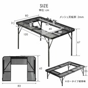 【サイズ】幅120×奥行80×高さ35/67cm [折りたたみ時]:幅82.5×奥行7×高さ61.5cm 天板サイド:3cmメッシュ天板厚:2mm【重量】約5kg 【耐荷重】約30kg