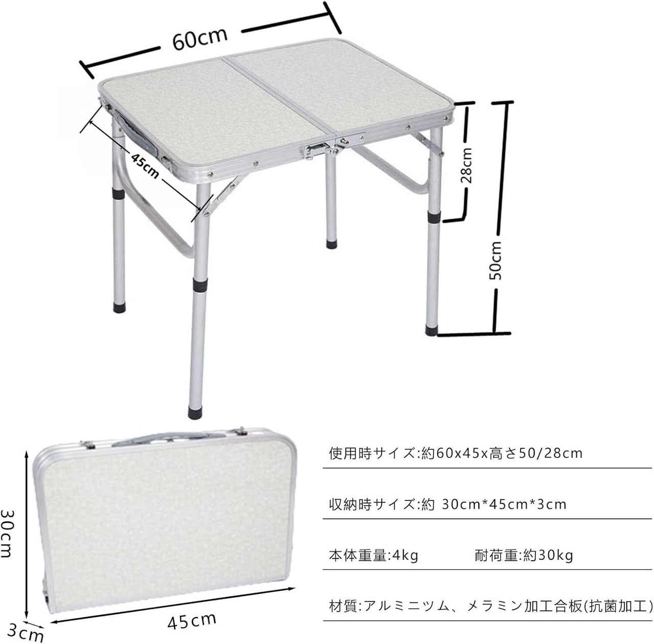 【サイズ】 :キャンプ テーブル使用時/約60×45×高さ28/50cm、収納時/約30×45×高さ3cm 。本体重量 :2.6kg。耐荷重:約30kg。