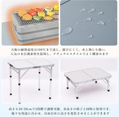 【素材】折り畳み テーブルの材質:フレーム/アルミニウム合金、他、天板/メラミン加工合板(抗菌加工) を使用、特徴は強度が高くて、タフで長持ち可能です、30kgの耐荷重が実現しています。折り畳み テーブル天板の耐熱温度は100℃まで達し、錆びにくく、水と熱にも強いので、鍋やフライパン、ケトルなどの熱い物を置いたりご使用頂けます。おしゃれな見た目でお手入れも簡単、水や汚れもすぐ落ち、実用性と耐久性を兼ね備えています。人気の木目調素材を使用し、ナチュラルなスタ