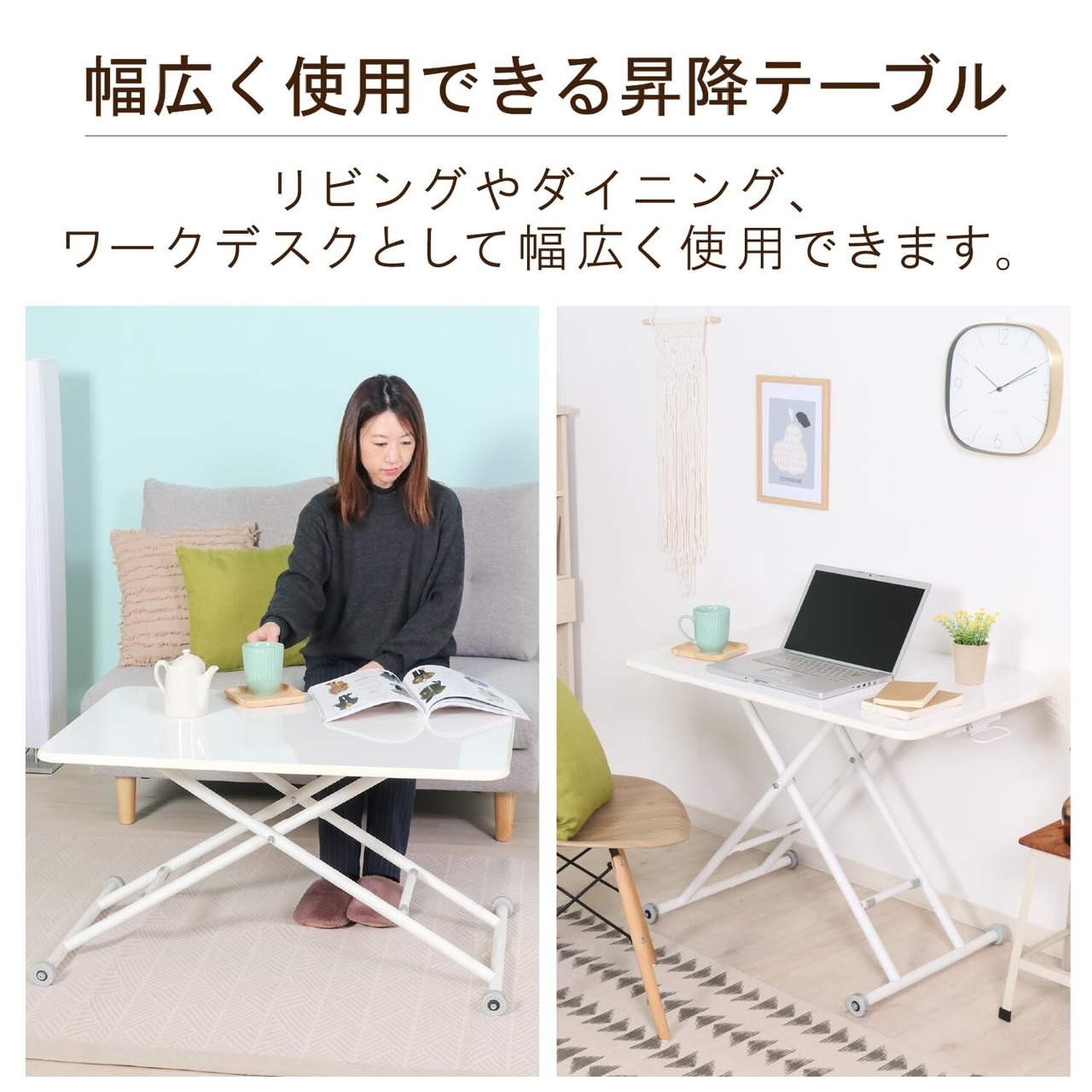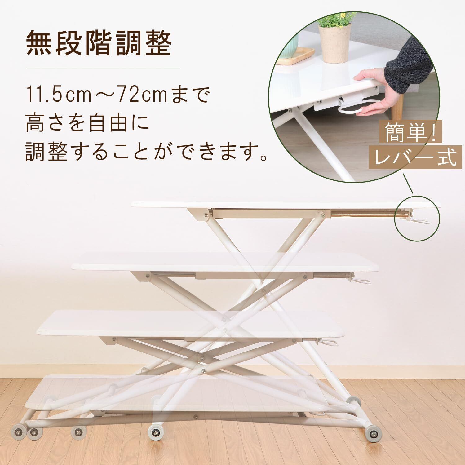不二貿易 昇降式テーブル センターテーブル 幅90~109.5×奥行60×高さ11.5~70cm ホワイト ガス圧 無段階調整 キャスター付き 完成品 74709