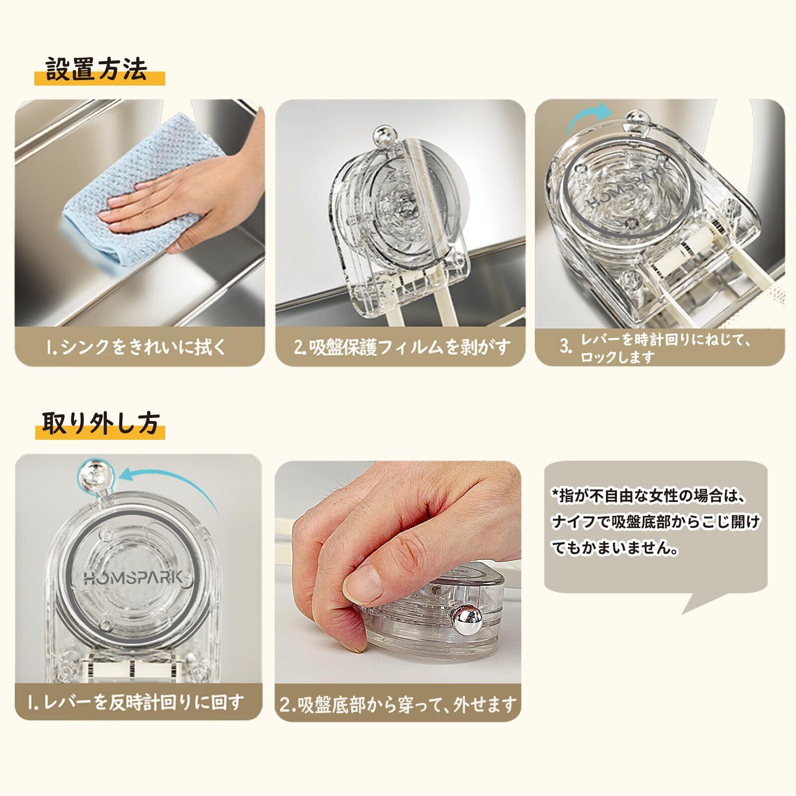 【スペース節約】:コンパクトでスリムなデザインにより、キッチンのスペースを有効に活用できます。シンクの縁や内壁に簡単に取り付けられるため、作業スペースを広く保つことができます。