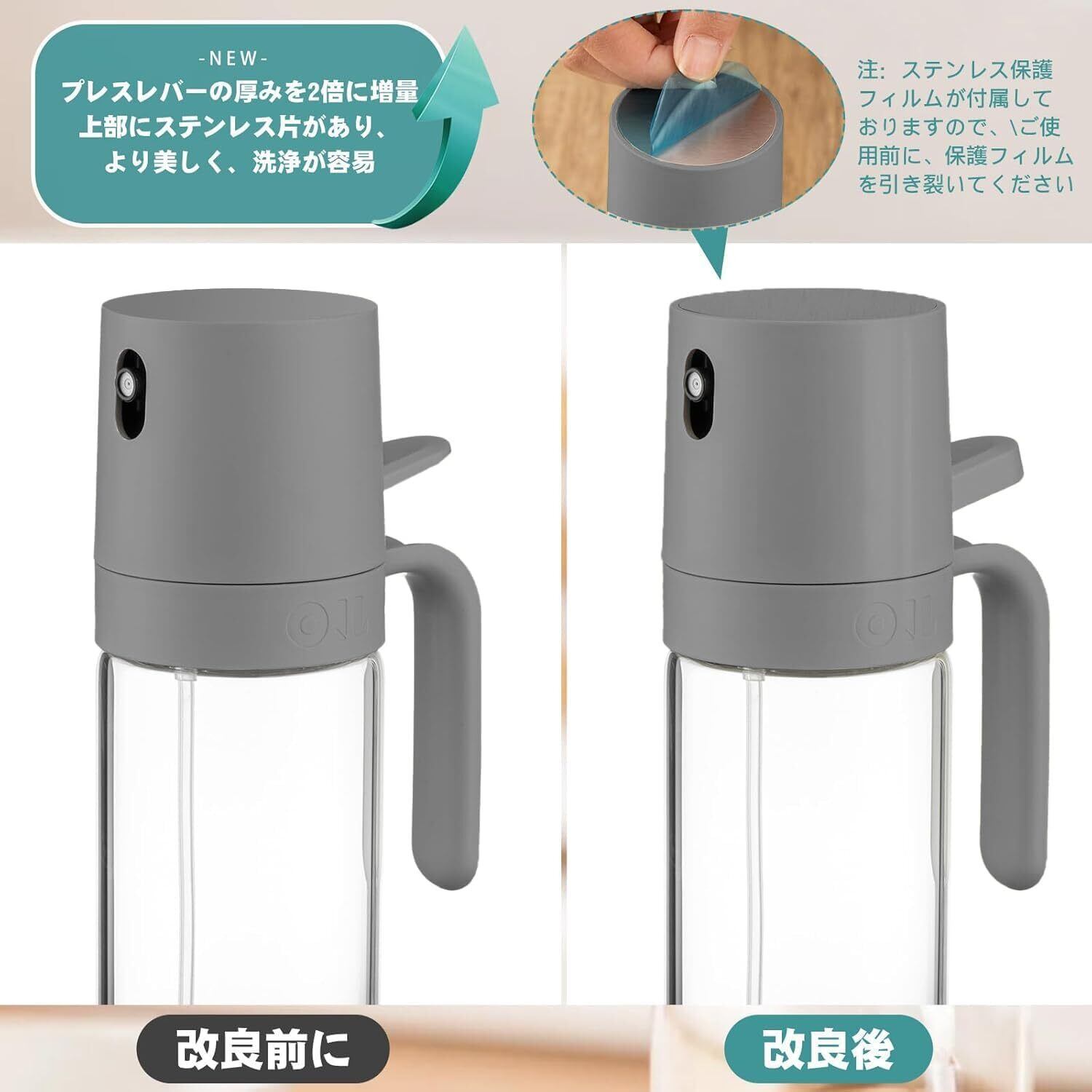 Geerow オイルスプレー 250ml 【日本JFSL370認証】オリーブオイル 耐熱ガラス オイルボトル オイル噴射管付属フィルター 調味料入れ 霧吹き スプレー オイルポット防水 片手でも使用可能 液だれしない 垂れない 食用油 グレープシード 料理用しょうゆ オイルスプレー各種調味料 (グレー)