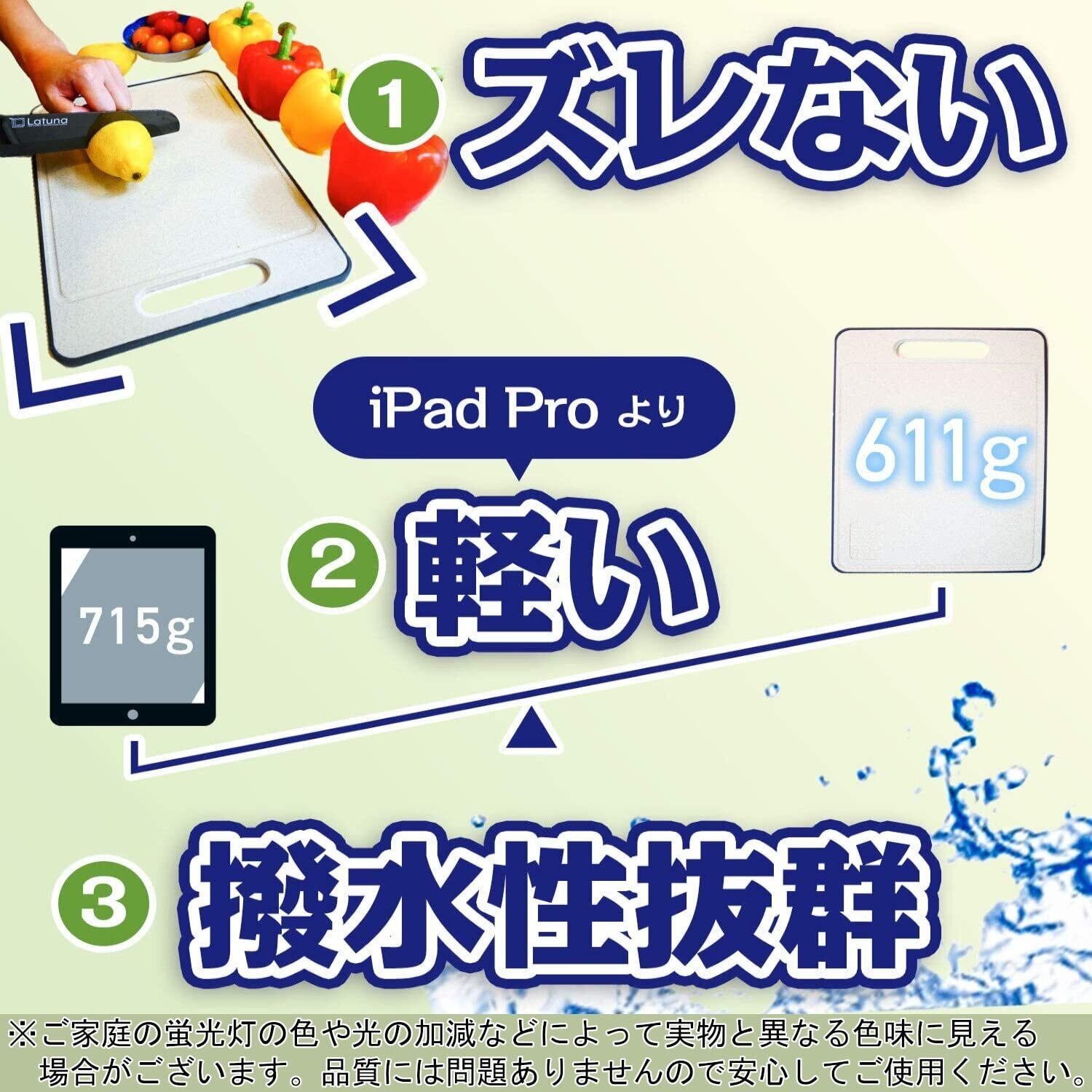 【商品基本仕様】主婦100人の「あったら良いな」という意見を反映し、1.滑らず 2.両面使えて 3.衛生的 な商品を開発致しました。生ものを切るときは表側・それ以外を切るときは裏側と分けて使えるから食中毒予防にもオススメです。また、洗った後の水の切れは衛生的である証で、水洗い後ふきんで軽く拭くだけで水が切れてるためお手入れがとても簡単です。本体 薄黄クリーム色:ポピプロピレン(PP)、縁側黒色:熱可塑性エラストマー(TPE)。サイズ:33.5 x 23.5 x 1.0cm。本商品は縁側の黒い部分がゴムのような質感となっているため滑りにくい構造となっております。※光の加減などによって実物と異なる色味に見える場合がございます。品質に問題はございませんのでご安心くださいませ。