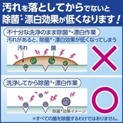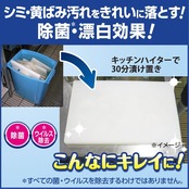 台所用洗剤では落ちない、ふきん・まな板などのシミ汚れ・黄ばみ汚れをきれいに落とします。ふきん・まな板などの除菌・消臭にもすぐれた効果を発揮。