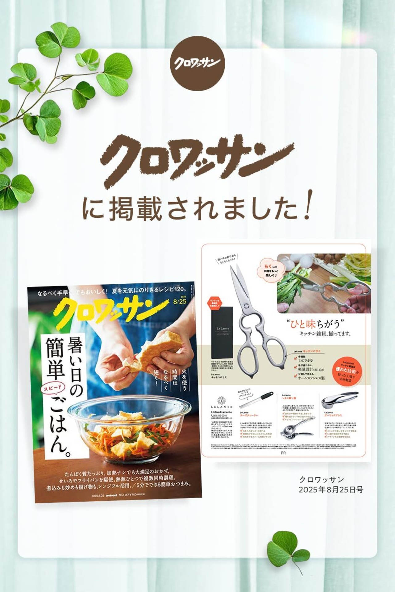【選ばれる理由】 LeLante キッチンハサミ がついに正式販売開始。ギザ刃加工で食材の断面も綺麗な切り口に。 また、硬度の高いステンレス素材を使用しているので耐久性に優れ、硬いお肉の筋や骨、乾物系も簡単にカットできます。