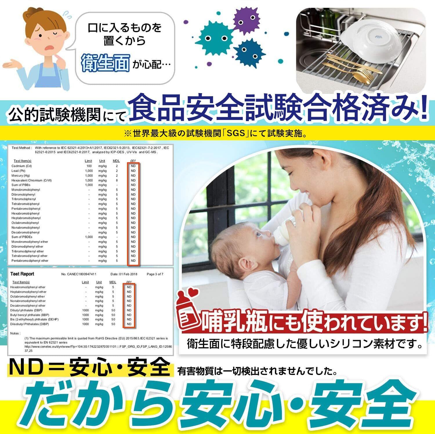 【公的試験機関にて食品安全試験合格済】世界最大級の試験機関(SGS)で合格しているため食器や哺乳瓶を挟んで乾かしても安心。シリコン素材のため汚れにくく、お手入れは洗剤を含ませたスポンジでサッと流すだけで楽チンです。食洗器も使用可能!※お使いの食洗器サイズによっては入らない場合がございます。