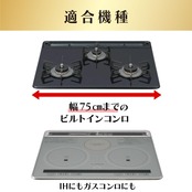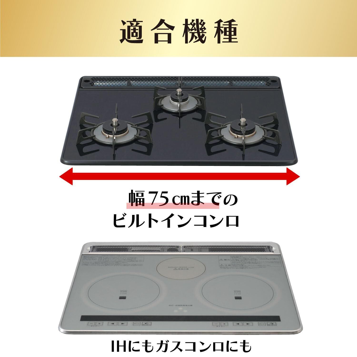 幅75cmまでのコンロに取付け可能なフリーサイズで、キッチンに自然に溶け込むクリアブラックを採用。