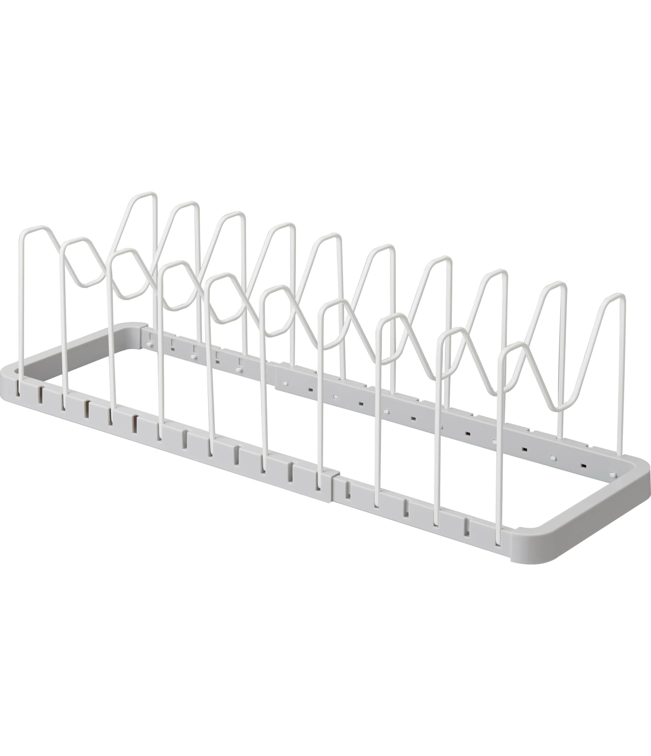 伸縮できるからシンク下のスペースに合わせてピッタリフィットするフライパン&鍋蓋スタンド。鍋やフライパンのサイズに合わせて仕切りパーツの位置は3cmごとに調整可能。持ち手が上になるから取り出しやすい持ち手置き付き。下に空いたスペースができるから収納力もアップします。