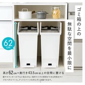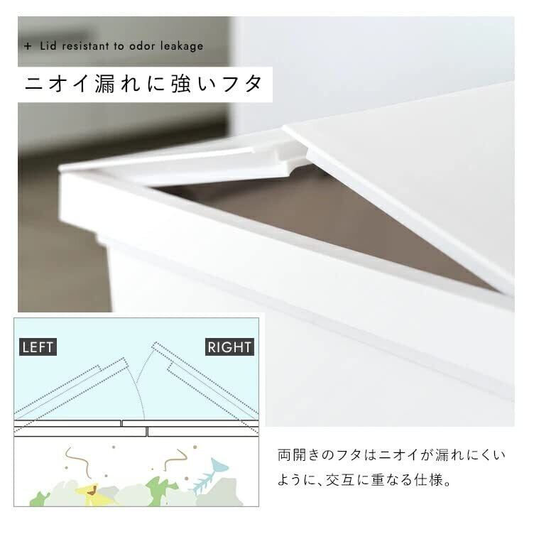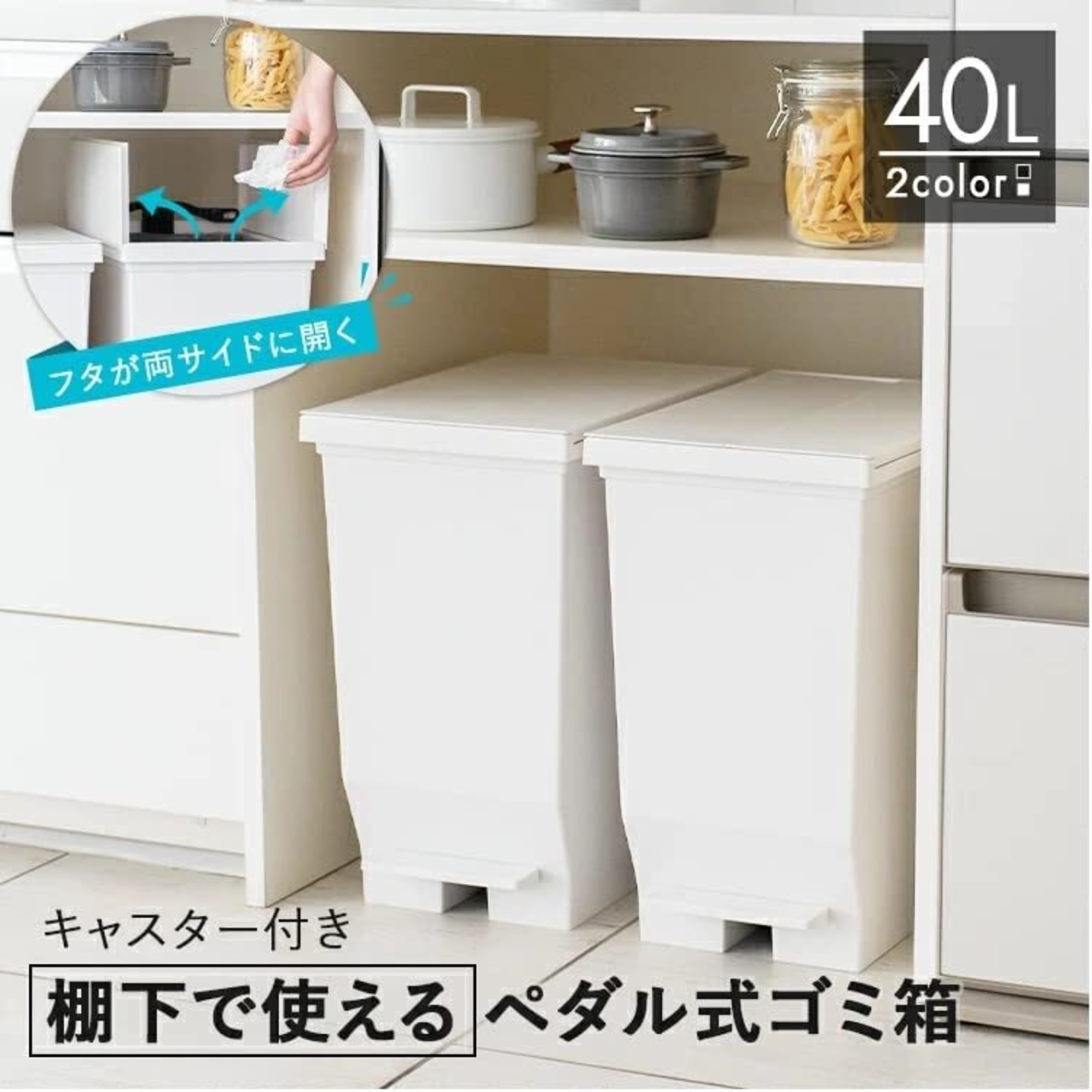 中央から開くため、開閉時の高さが抑えられる両開き設定で、キッチンカウンターの下に最適。ペダルを踏むことでフタが開けられるため、手で触れることなく衛生的です。