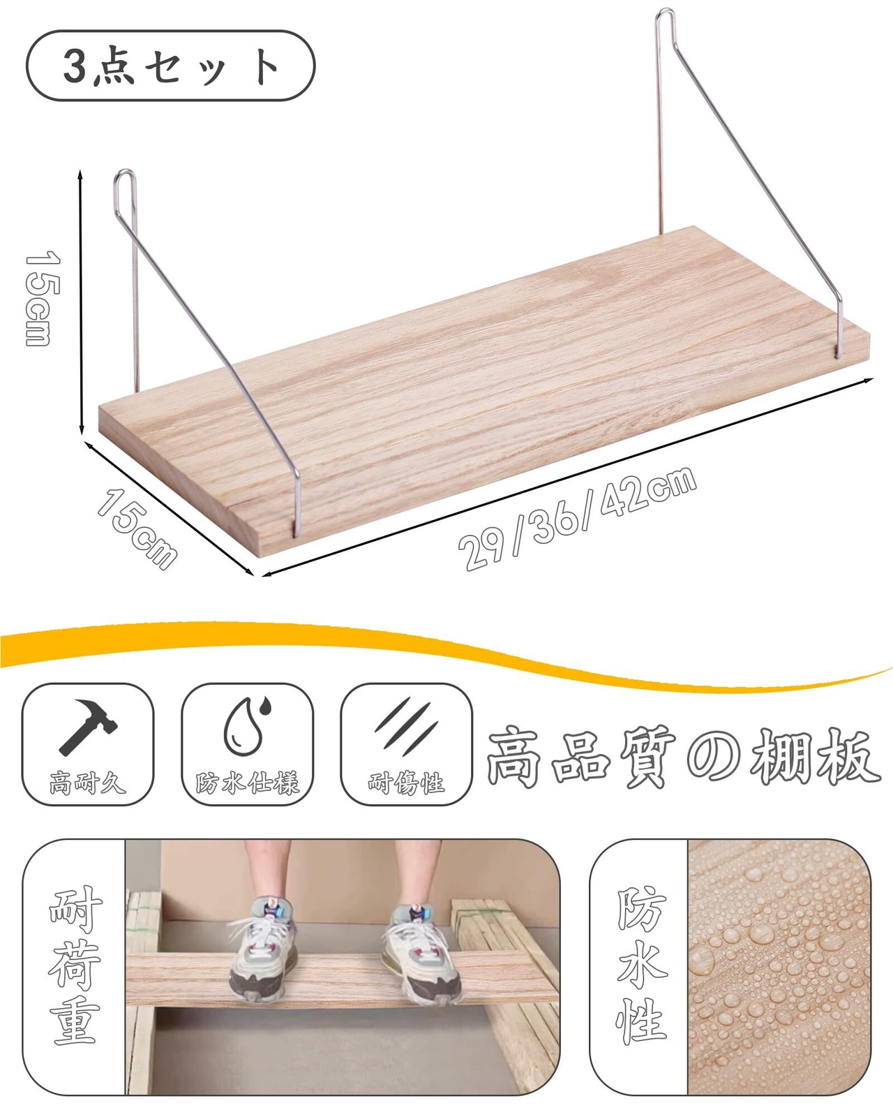 【品質】製品サイズ:長さ:29/36/42cm三点セットです。幅:15cm、厚さ:1.5cm。ワイヤーの高さ:15cm。すべての棚板は頑丈な作り、自宅用にも家族や友人へのプレゼントにも最適です。は品質と返金を提供します。商品についてご不明な点がございましたら、ぜひメールでお問い合わせください。問題解決のお手伝いができれば幸いです。