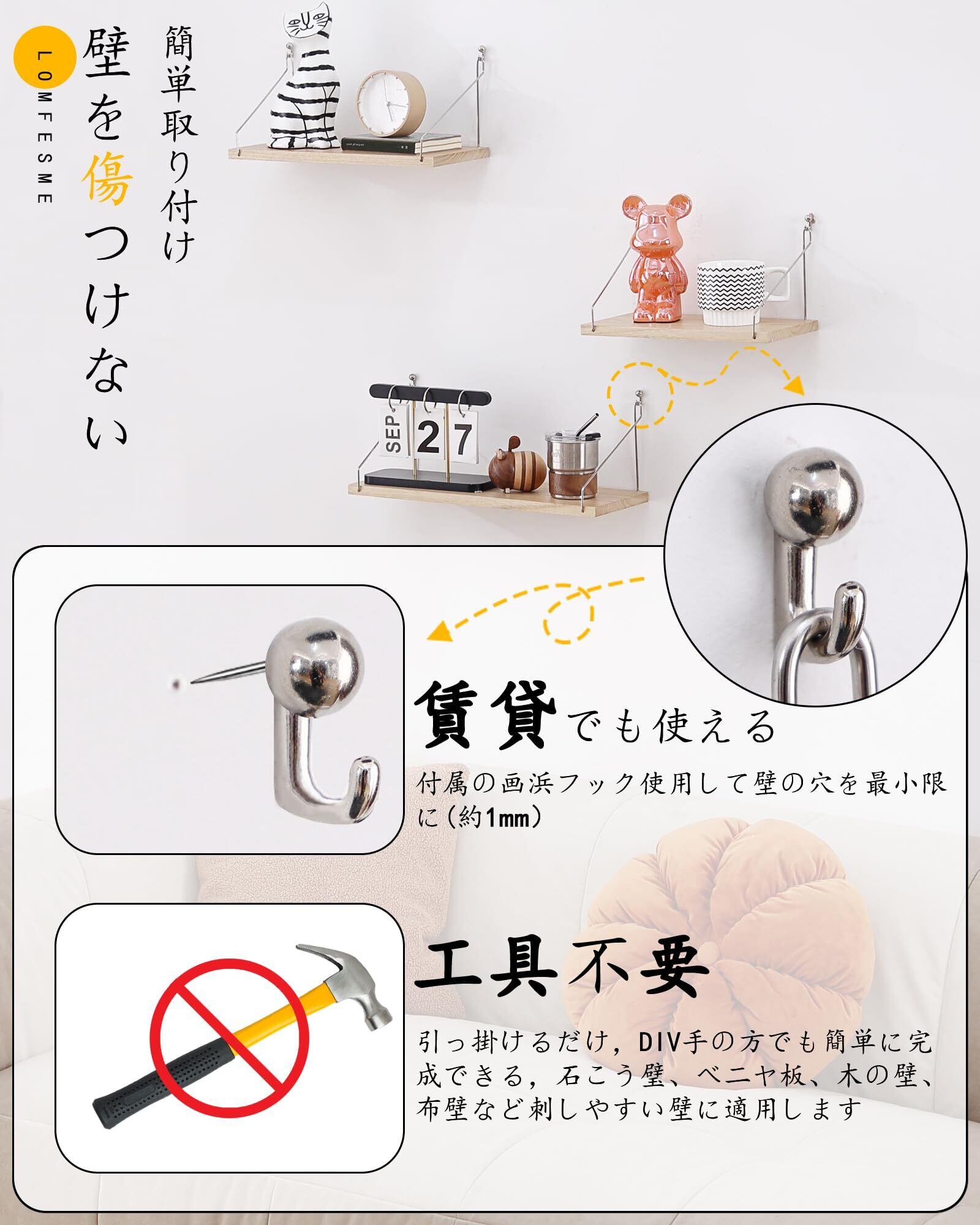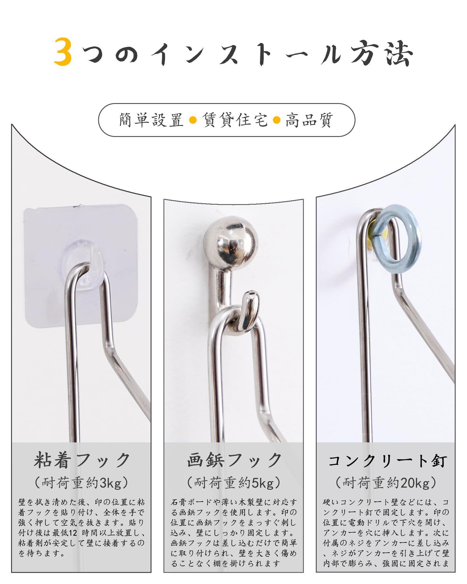 【壁を傷つけない簡単取り付け】《事前準備の必要なし》画鋲フック使用する場合は、ドライバーなどの工具もいりません。《壁はほぼ無傷》棚を設置した際のキズはほとんど残りません、ほぼ無傷です。棚を丁度真正面から見たときにバランス良く、美しく見えます。