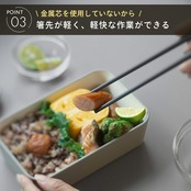 【扱いやすい軽さ】金属芯を使用していないので、箸先が軽く、調理はもちろん、お弁当の飾りつけなど軽快に作業ができます。