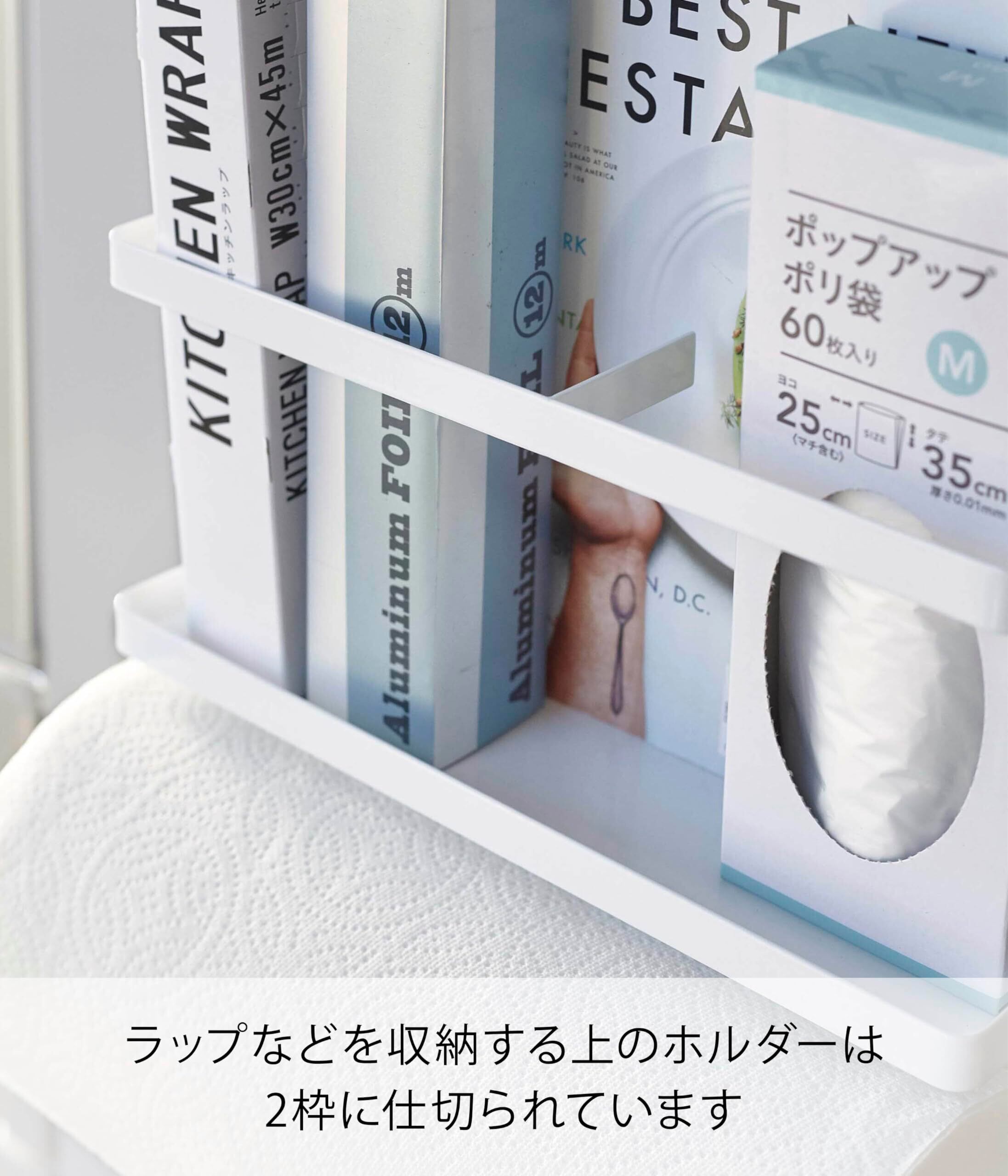 よく使うラップとキッチンペーパーを一括収納。