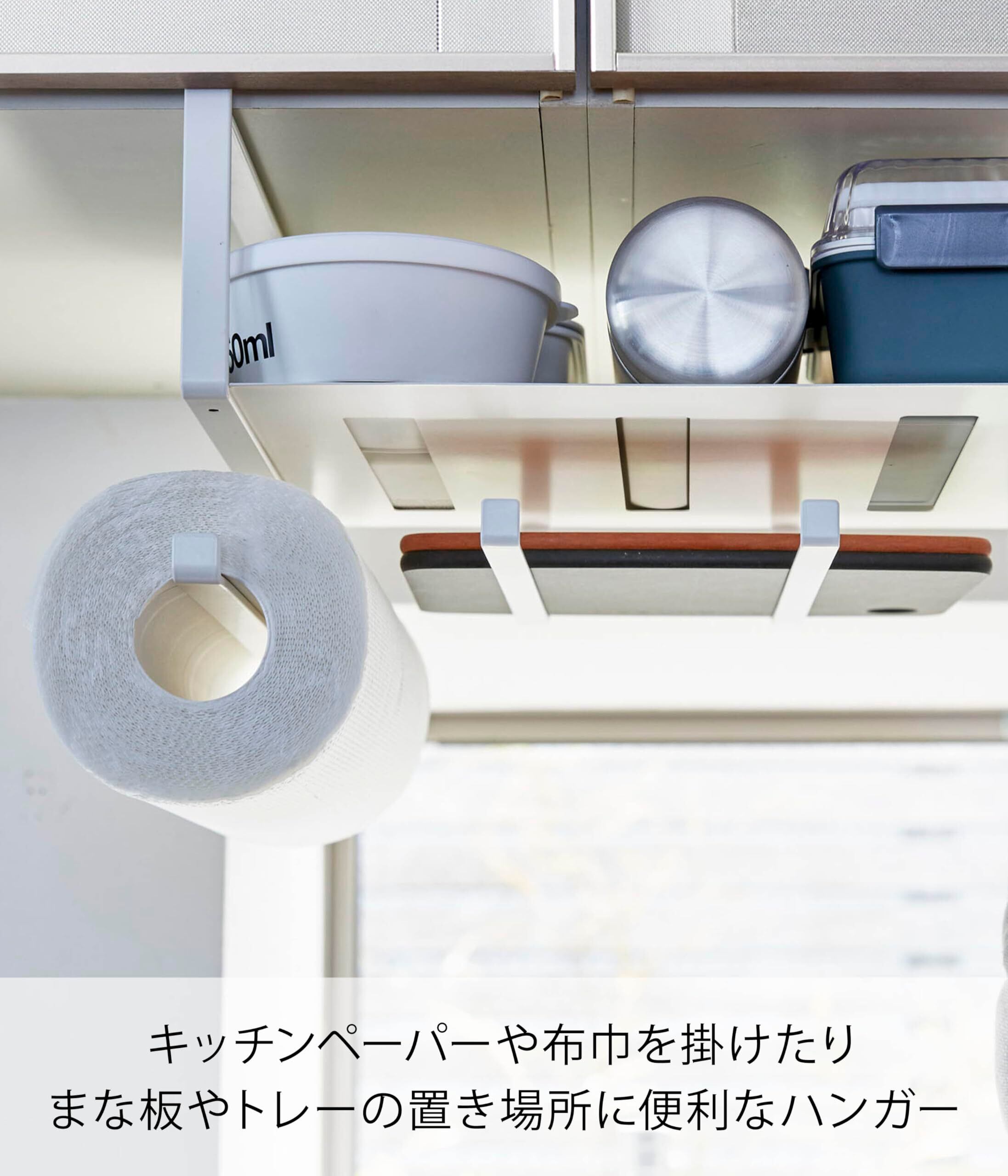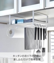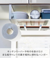 取付可能な吊り下げ戸棚:棚板の厚さ約2.5cmまでに対応 ポリ袋・ペーパーボックス用取り出し穴サイズ:約W2.5×D16cm 対応サイズ:直径約11cm・高さ約23cmまでの一般的なキッチンペーパーロールに対応