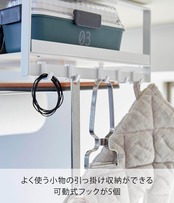 可動式フック5個は良く使うキッチン小物の収納に。