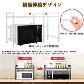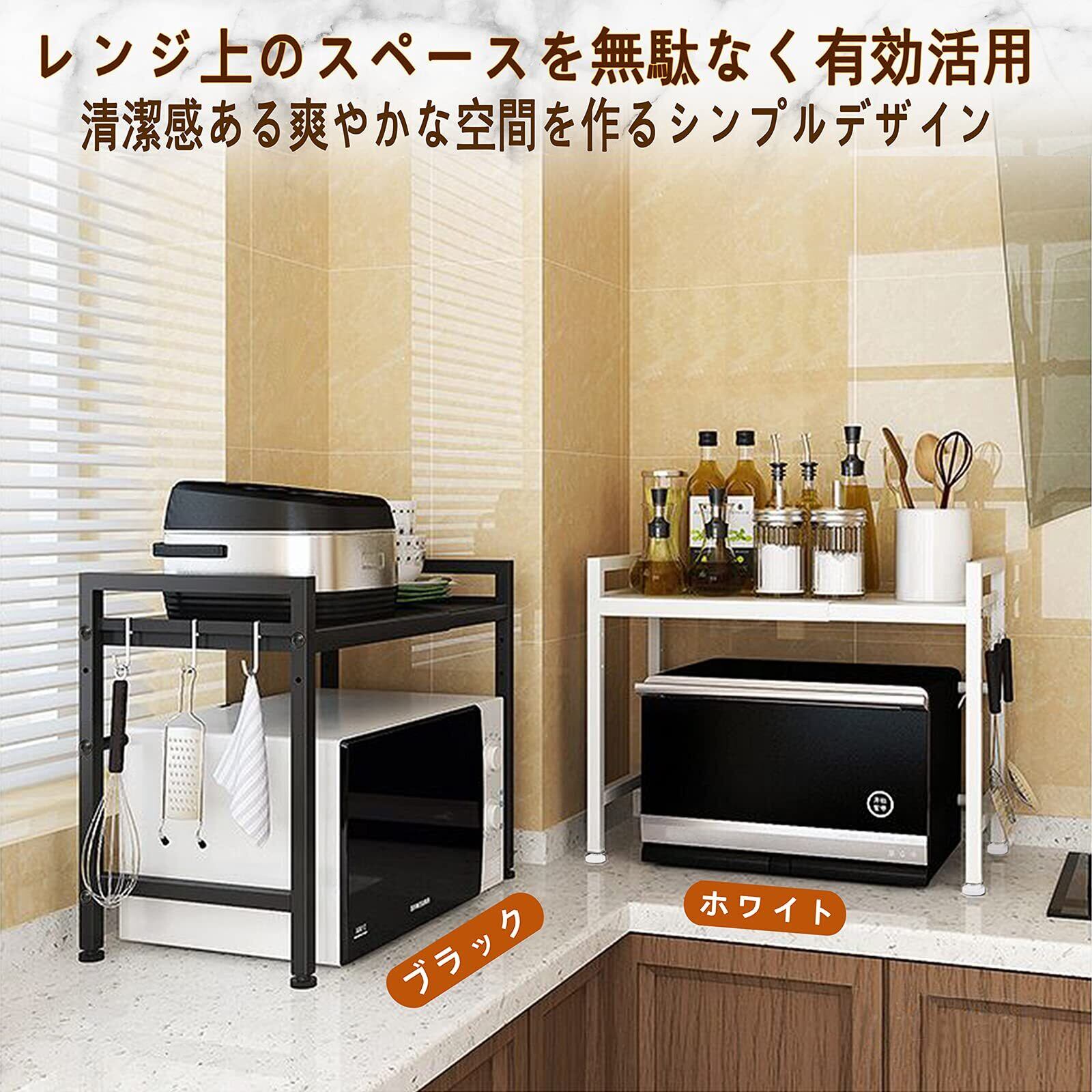 【高さ2段階調節可・幅伸縮式】収納ラックの幅の伸縮範囲は40cm~60 cmの間で無段階に調節でき、可動棚板は約5.5cm間隔で2段階で高さ調節可能で、使い勝手がとても良いです。電子レンジやオーブン等の小家電に適用し、調味用品、キッチン用品を簡単に綺麗に収納できます。キッチンのスペースをよくご活用いただけます。