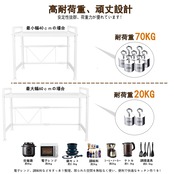 【安定感をアップ】 本商品は四つの足によって固定されますから、揺れにくいです。上層の最大荷重量は70キロですから、数多くのものを置いても棚が前に傾きません。また、その四つの足には高さを調整できるアジャスターが付いていますから、平らではないところにも、そのアジャスターを少し調整したら、棚が揺れません。そして、上層の両側は手すり設計を採用し、置物倒れ防止する上、小物もフックで掛けられ、雑巾や調理道具など吊り下げ収納できます。