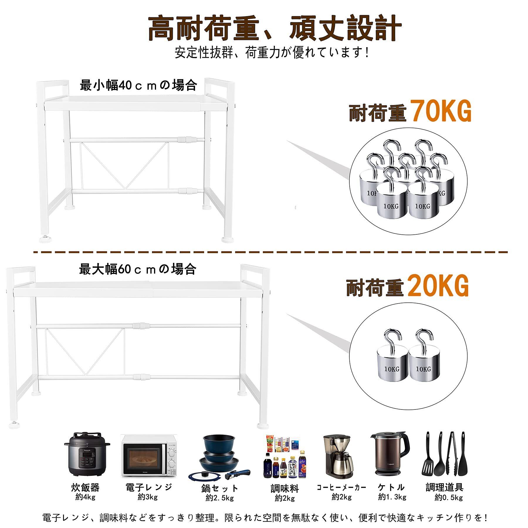 【品質が良く、耐荷重能力が強い】上質なスチールを採用しており、高温で焼付塗装を施しており、汚れ付いた時は、サッと拭き取るだけで、きれいになり、お手入れはとても簡単です。水や水蒸気にも強くキッチンラックに最適な材質です。錆、腐食などを防止でき、耐久性が優れています。ラックの耐荷重は約20-70Kgで、幅により異なります。最小幅40㎝の場合、耐荷重は約70㎏、最大幅60㎝の場合、約20㎏です。普通の小電気製品を棚板の上に置いて、棚板の変形や壊れ等の心配なくて安定です。安心にご使用できます。