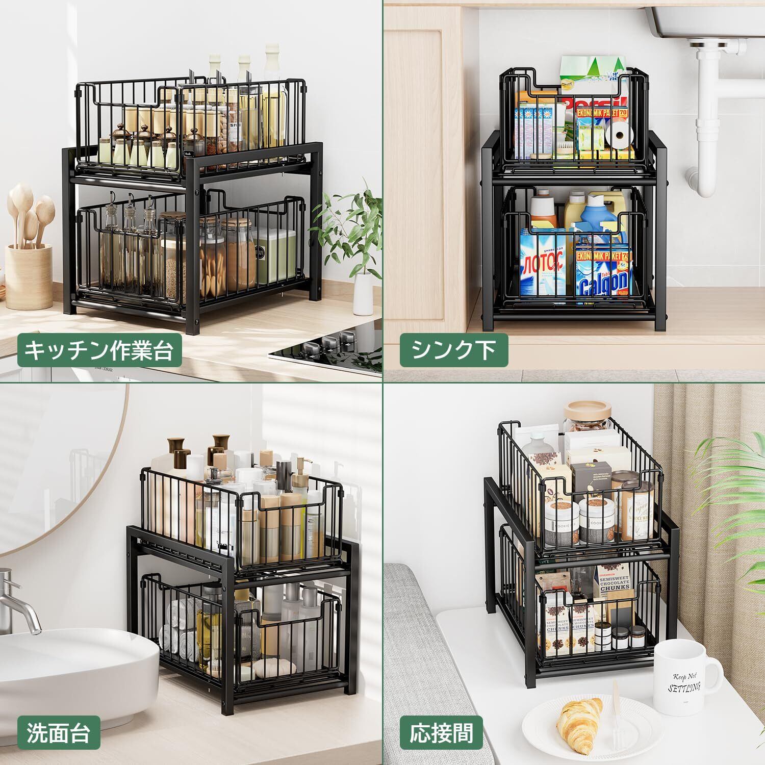 多機能ラック:シンク下はもちろん、調味料置くことも、洗面台下を置くことも、デスクの雑物や化粧品などは収納できます。奥のものが取り出しやすく、しまいやすいスライド式、スムーズに引き出せる、いろいろな場所に大活躍です。