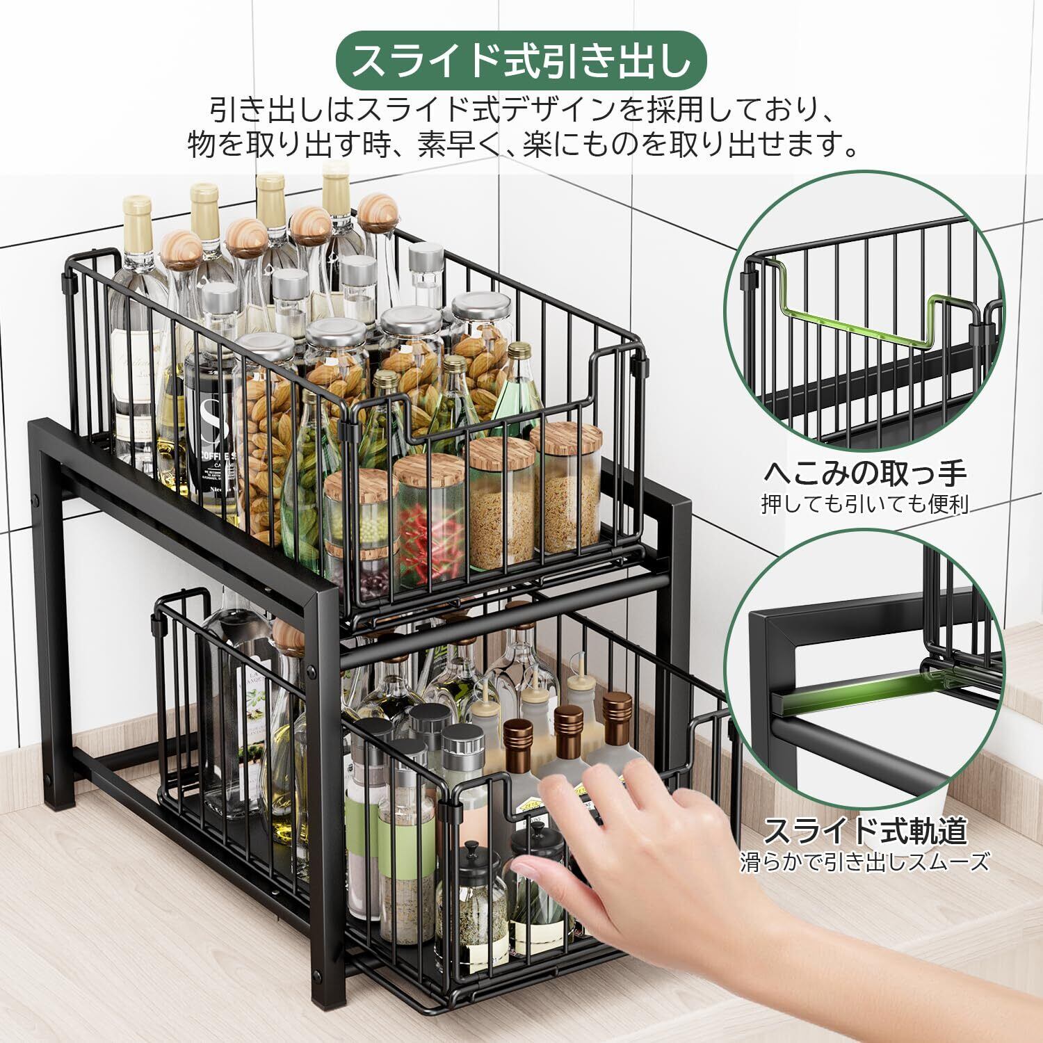 ラクラクスライドで、シンク下の奥まで有効活用:2段スライドラックは細かなキッチンツール、食品・ラップ・ホイルなどのストック品をシンク下空間利用して効率よく収納可能です。スライド式でスーッと引き出しが手前にスライドするから、取り出しやすく、片付けやすい。