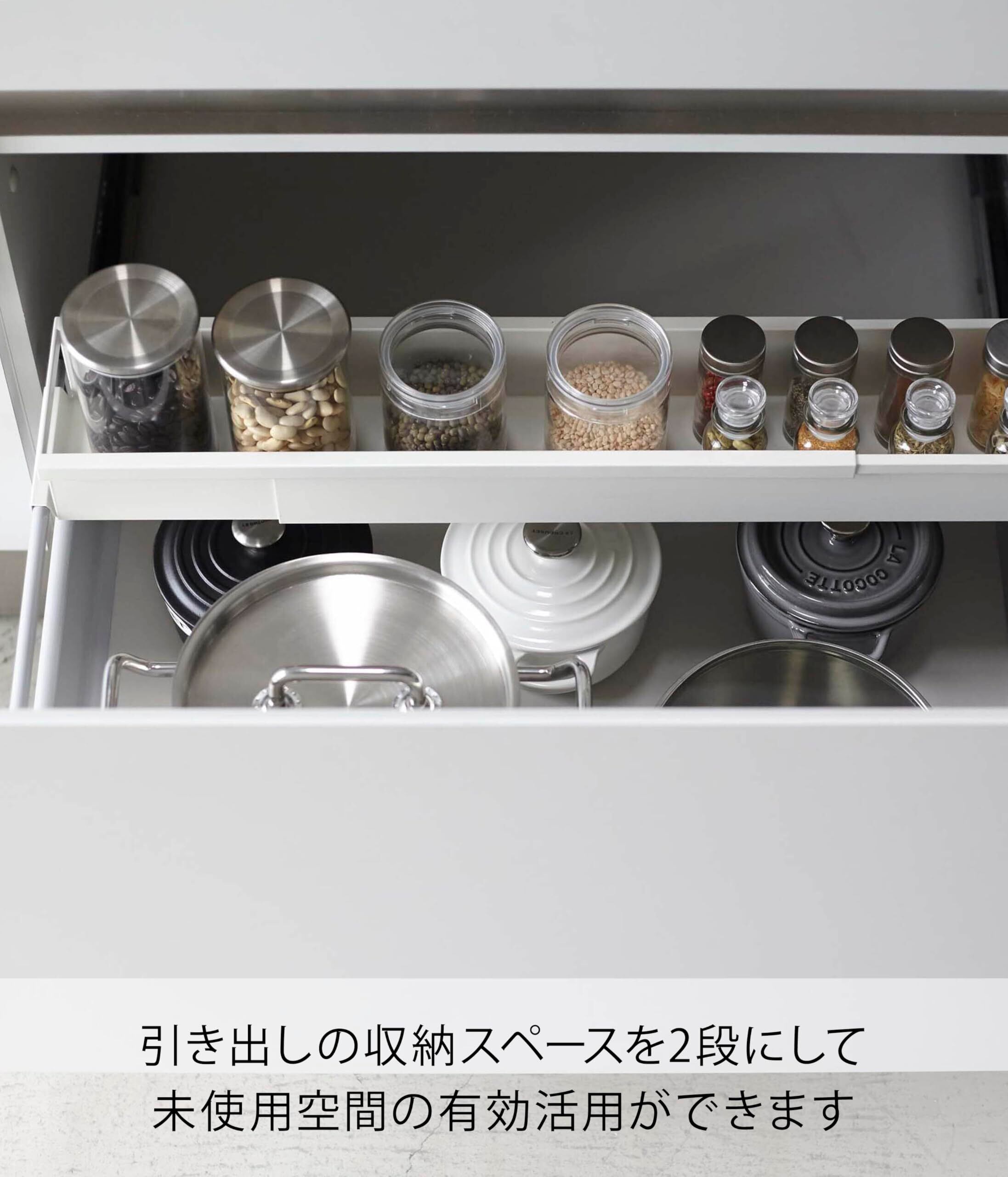 伸縮できるから引き出しの幅に合わせてピッタリフィットする伸縮ラック!引き出しのスペースを2段に分けられます。