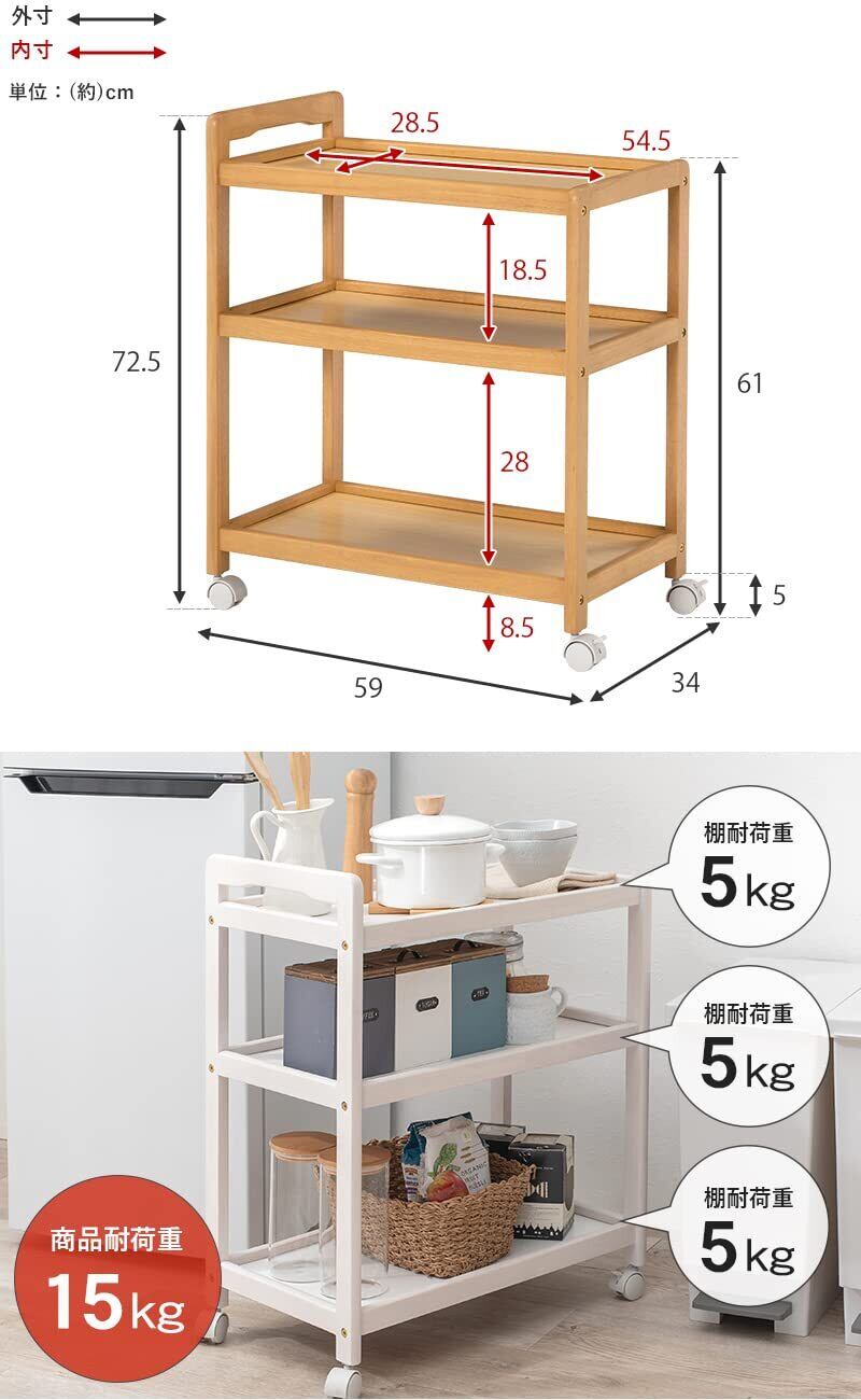 【取っ手付きで移動がしやすい】:取っ手付きで移動がしやすい木製キッチンワゴン。鍋や食器類、調味料、食材を多く収納しても移動がラク!高さがあるものも一つのワゴンに収納すれば見た目もすっきり。3段棚は各棚約5kgまで物を載せられ、スリムな見た目ながら大容量。