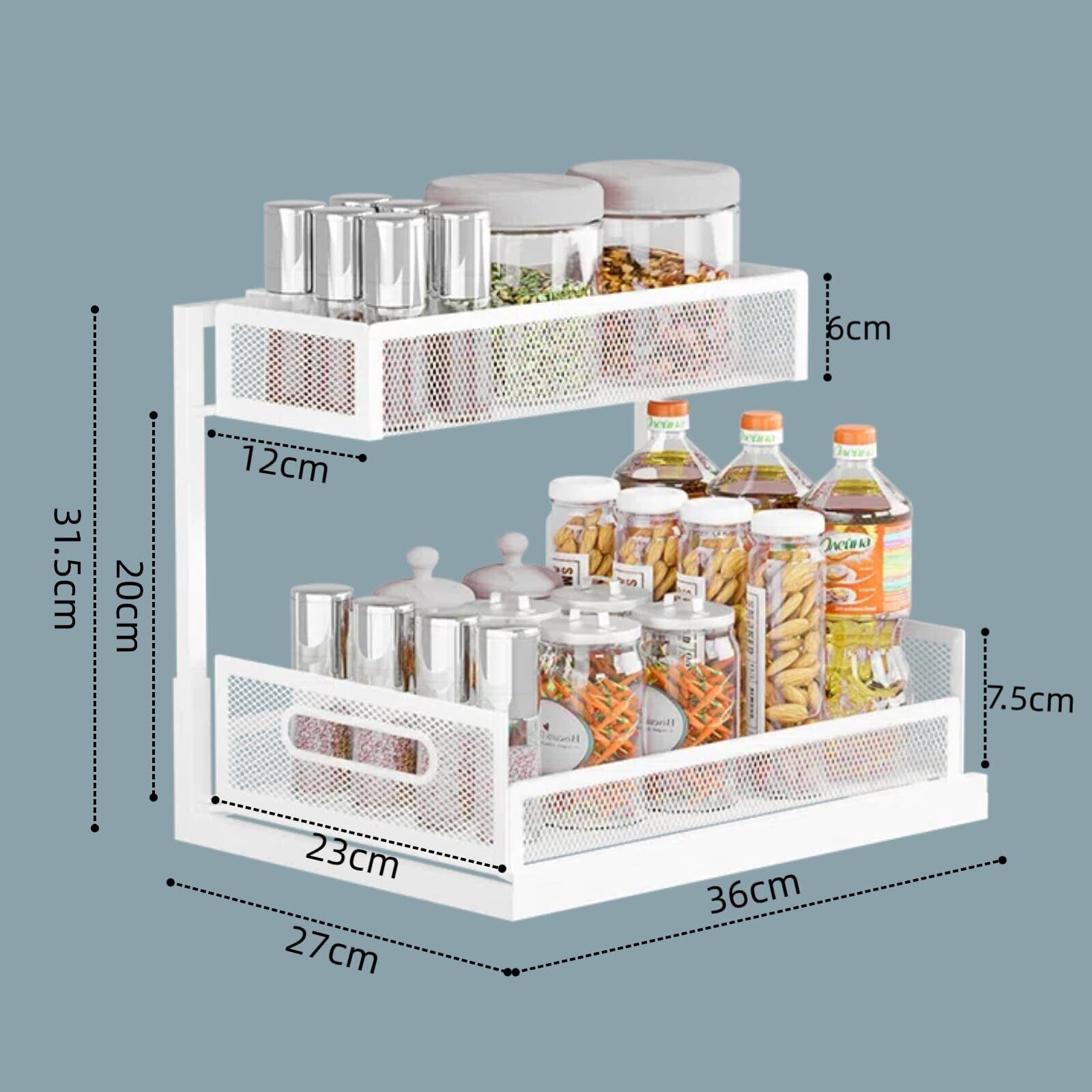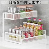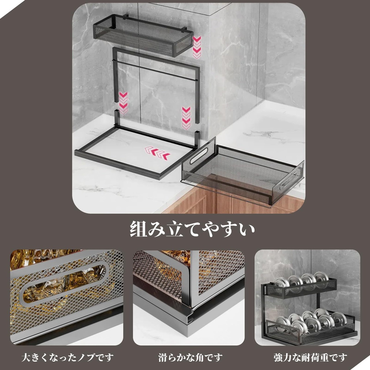【幅広い用途】2段キッチン下収納で、キャビネット、カウンタートップ、コーナー、シンク下のスペーその他の場所で使用できます。 乱雑な環境を避けるために、洗濯洗剤、スキンケア用品、キッチン用品、調味料、化粧品などをうまく整理できます。 キッチン、バスルーム、ランドリールーム、ベッドルームなど様々なシーンで活躍します
