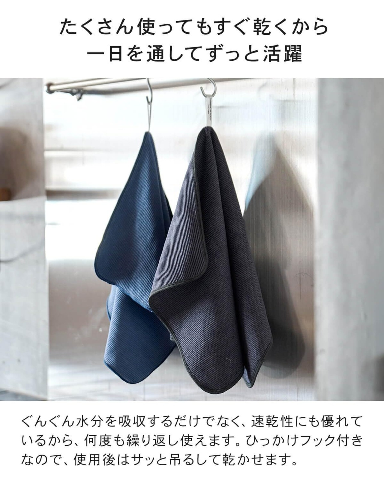 【肉厚やわらか生地で拭き取りやすい】製法の程よい弾力のある肉厚生地は、対象物に優しくフィットし水滴をサッと吸水します。適度な厚みで食器にまとわりつかず、ストレス無くご利用いただけます。