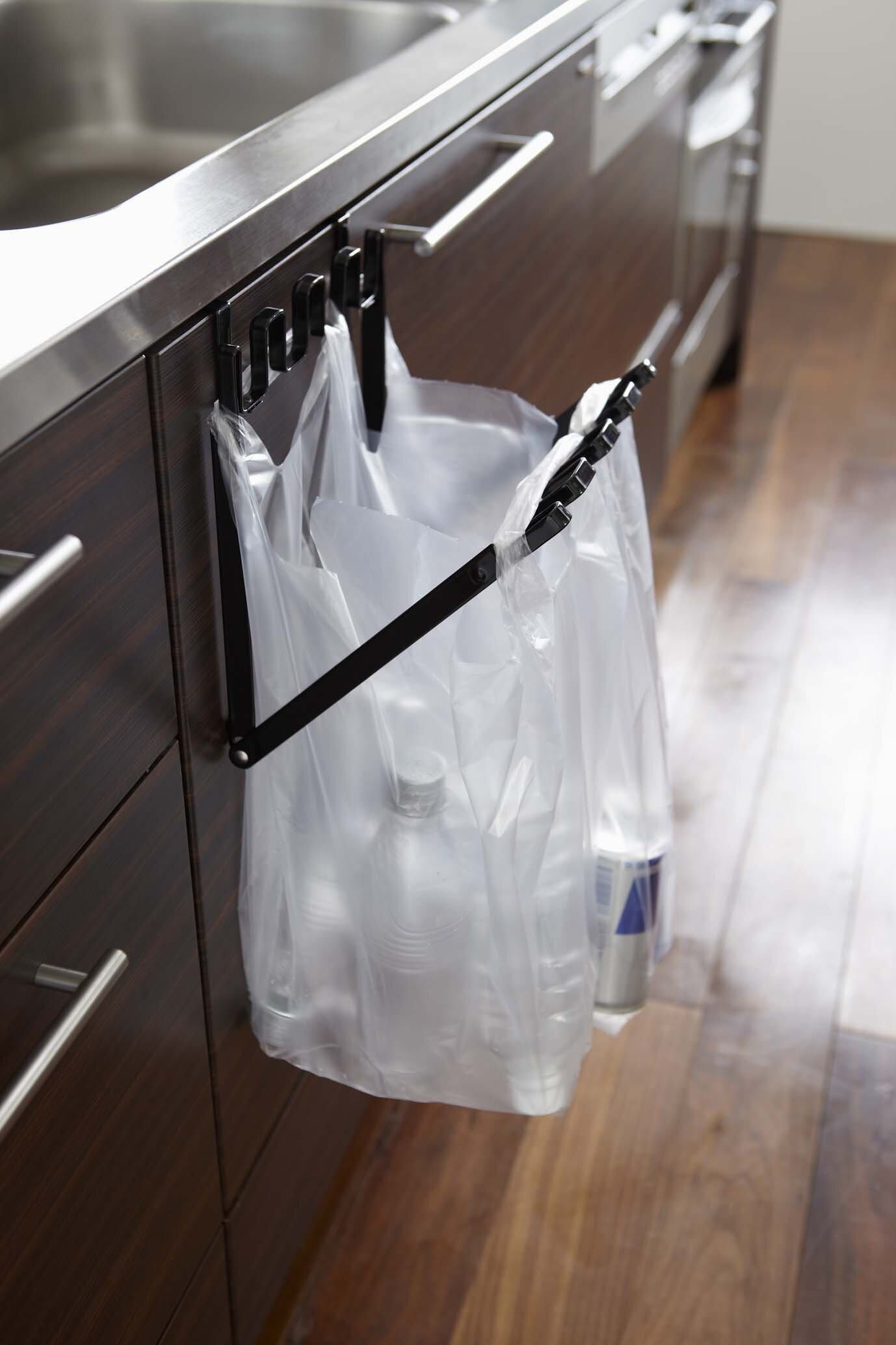 シンクのドアに設置して、スーパーのレジ袋を引っ掛けるだけで調理中にでるゴミをそばでポイ! 分別も可能。