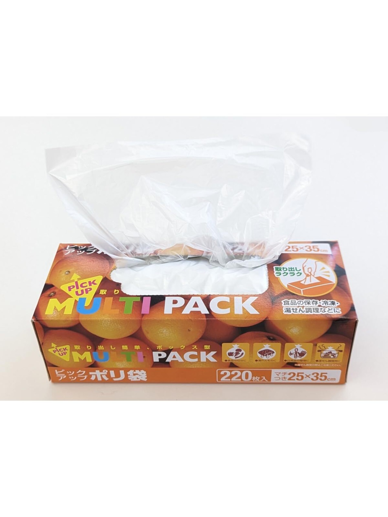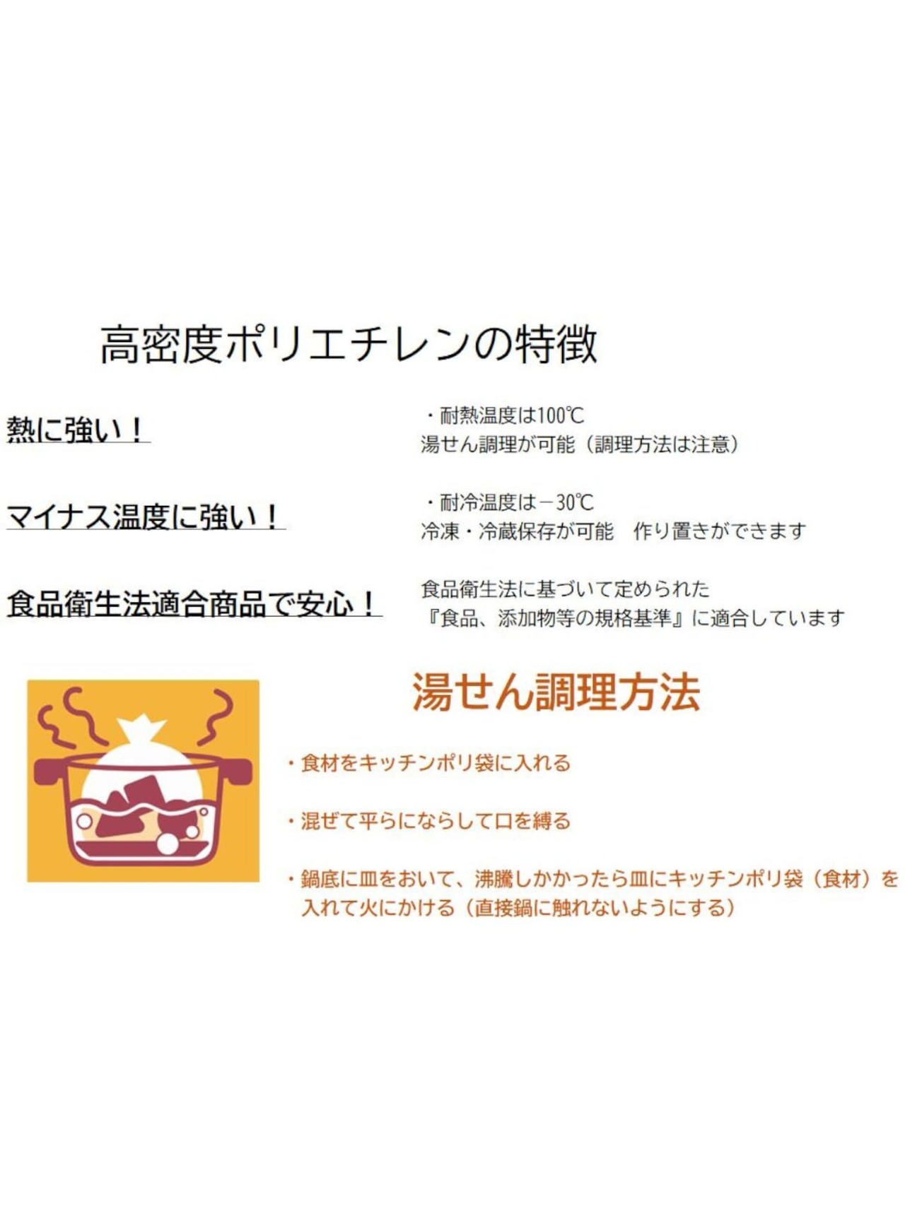 <商品特徴>●1枚ずつ取り出しやすいBOXタイプ●大容量220枚入! ●食品の保存や小分けに●湯せん調理に●濡れたものの保存に●日用品の整理に●様々な用途でお使いいただけます●中身が見える半透明タイプ●取り出しやすいカットライン入り●たっぷりのマチ付きで使いやすい●本品は、食品衛生法に基づいて定められた、添加物等の規格基準」に適合しています<使用上のご注意>●湯せん調理の際は十分にご注意ください●ガスコンロやオーブン、オーブン機能付きレンジ、オーブントースターなど熱源のそばに置かないでください。高温になると袋が溶けて使用できなくなる場合があります●突起のあるものを入れると材質上破れることがありますのでご注意ください●袋の両サイドを熱加工しているため、強く引っ張ると避ける可能性がありますのでおやめください●保管の際には、直接日光がの当たる場所や、高温多湿の場所に置かないでください。まれに変色等を起こす場合があります●ポリエチレンを加工した際に生じるにおいが製品に残っていることがあります●パッケージ(包装)は紙材のため、まれに取り出し口開封時に、ミシン目部分より紙粉が製品に付着することがあります<警告>●この袋は、幼児や子供にとって窒息などの危険を伴うものです。幼児や子供の手が届かないところで保管してください