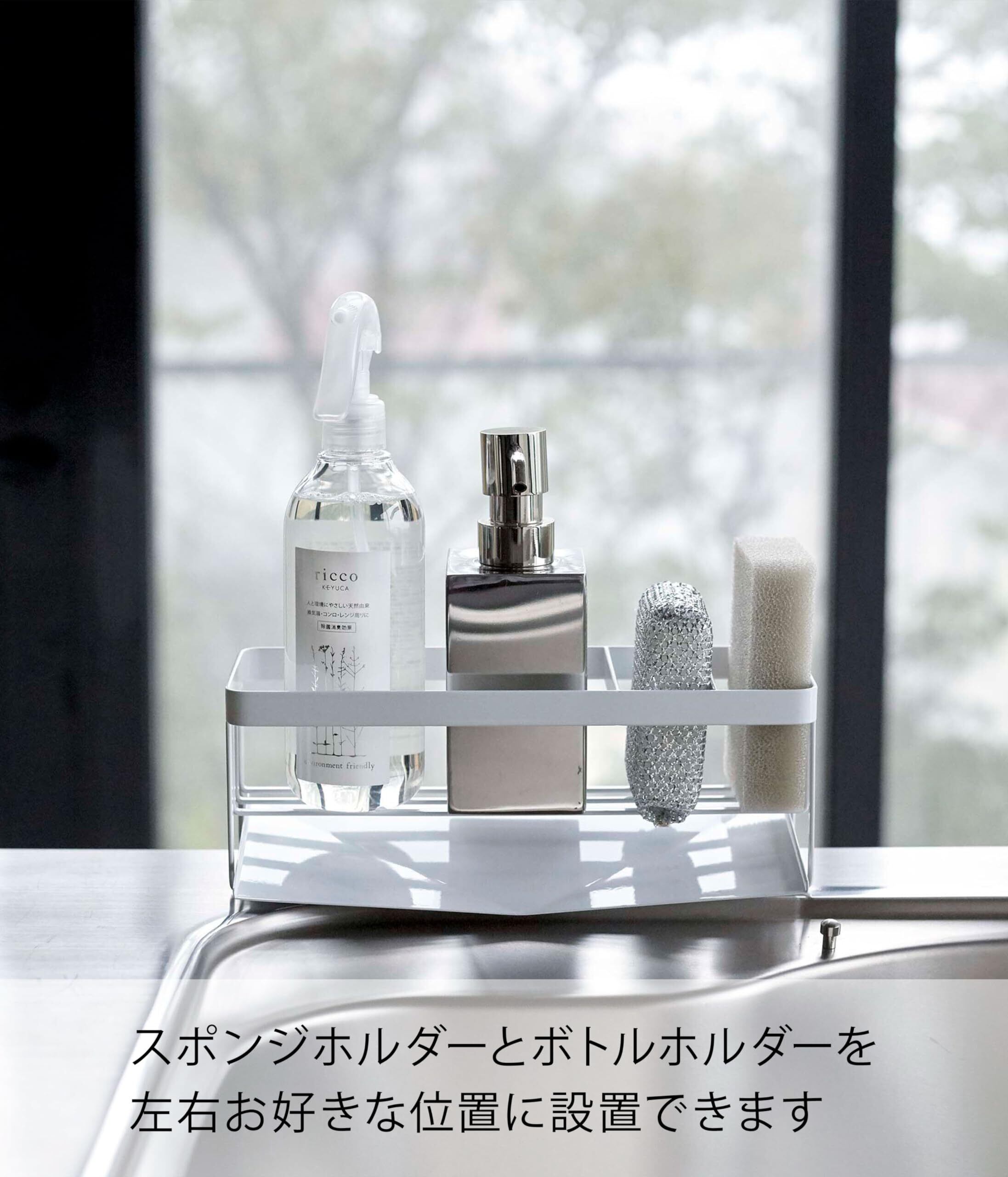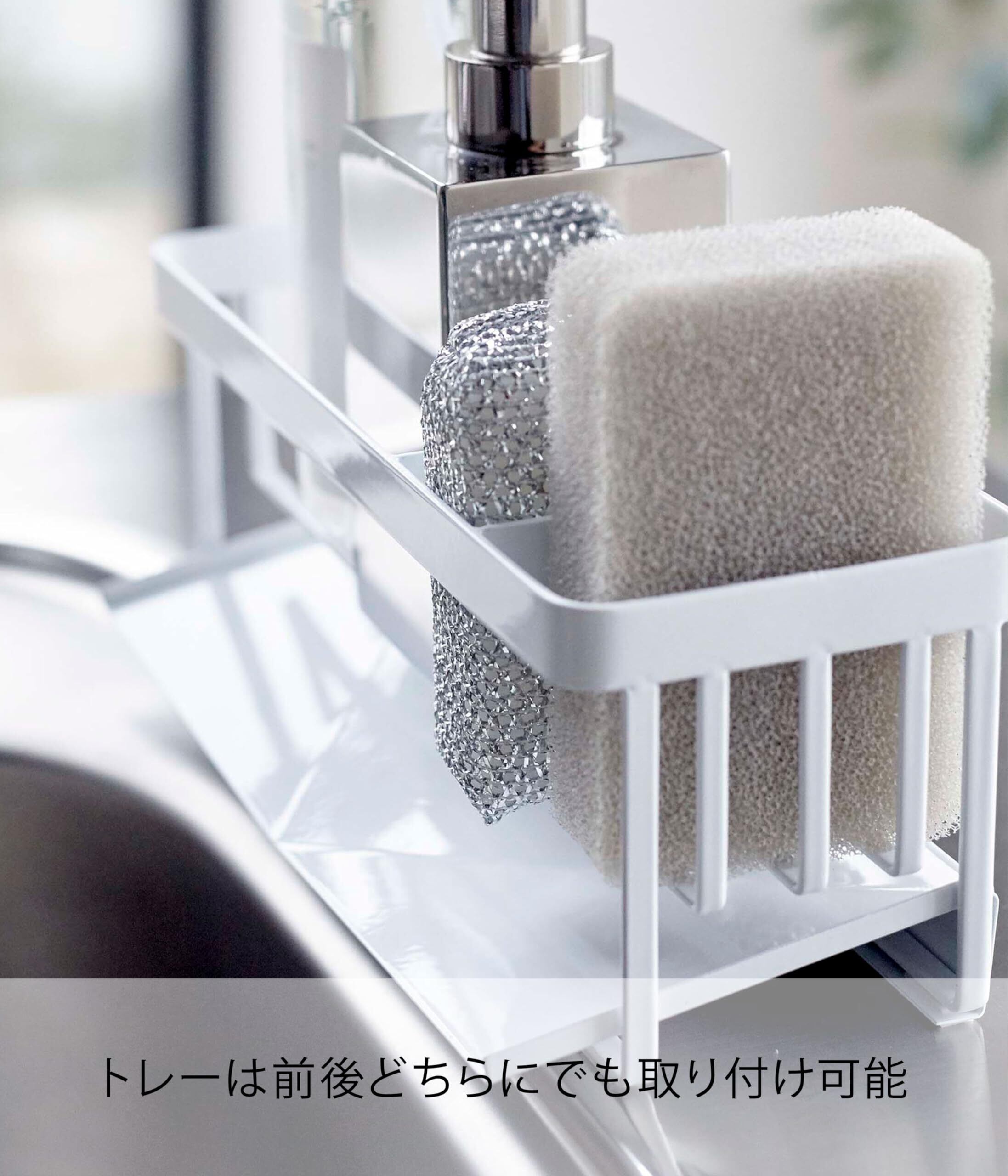 トレーが前と後ろどちらからも取り付けできるのでスポンジホルダーとボトルホルダーを左右お好きな位置に設置できます。