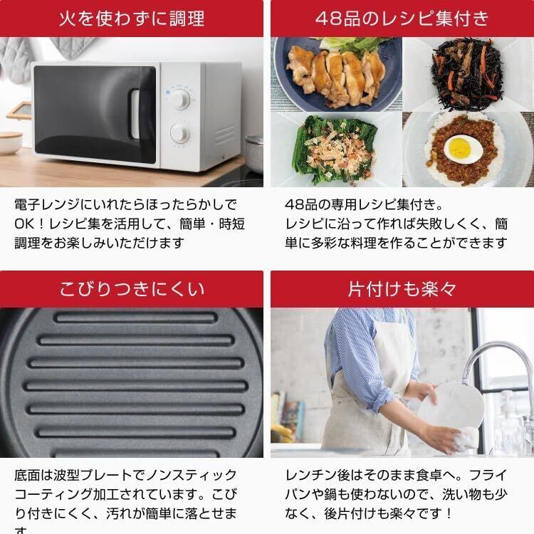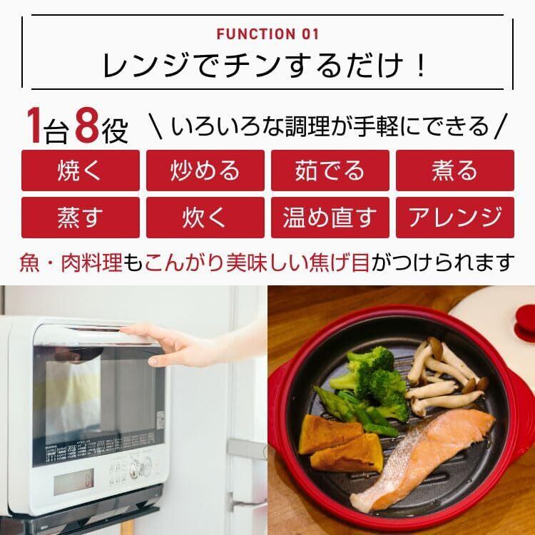 電子レンジに入れるだけで魚料理や肉料理、ご飯、パスタまで作れる1台8役のレンジ調理器です。48種類のレシピが付いています。焼く、炒める、茹でる、煮る、蒸す、炊く、温め直す、アレンジ料理を鍋や火を使わずに簡単調理!