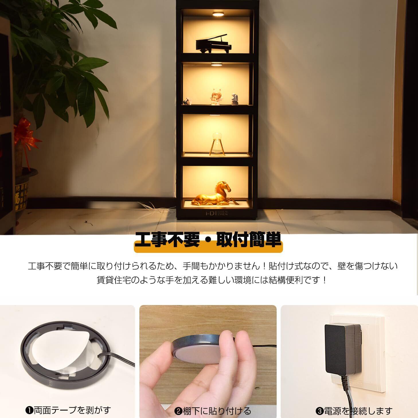 【電気工事不要・取付簡単】LEDライトは強力両面テープ付き、複雑な工事が不要、お好みの場所に直接に貼り付けます。一本の連接ケーブルですべてのLEDライトを簡単に接続できます。壁を傷つけない、賃貸住宅のような手を加える難しい環境には結構便利だ!