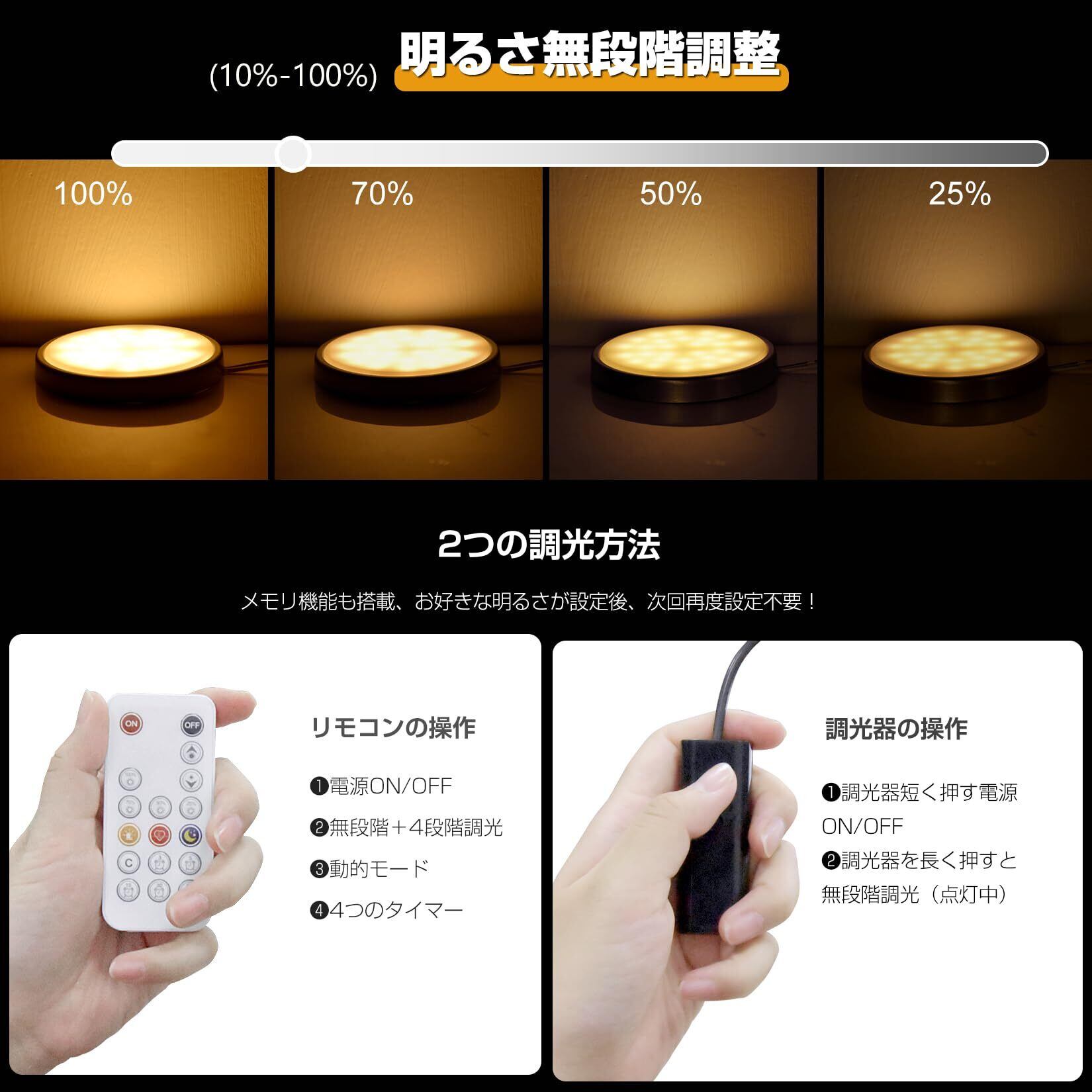 Wobane LED キャビネットライト 4個セット 電球色 リモコン制御 調光・タイマー・常夜灯・メモリ機能 工事不要 貼付け式 ダウンライト 高演色性 ショーケース/フィギュア/キッチン照明 棚用 おしゃれ 間接照明 PSE認証済 電源アダプター付き ギフト包装可 人気プレゼント