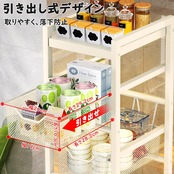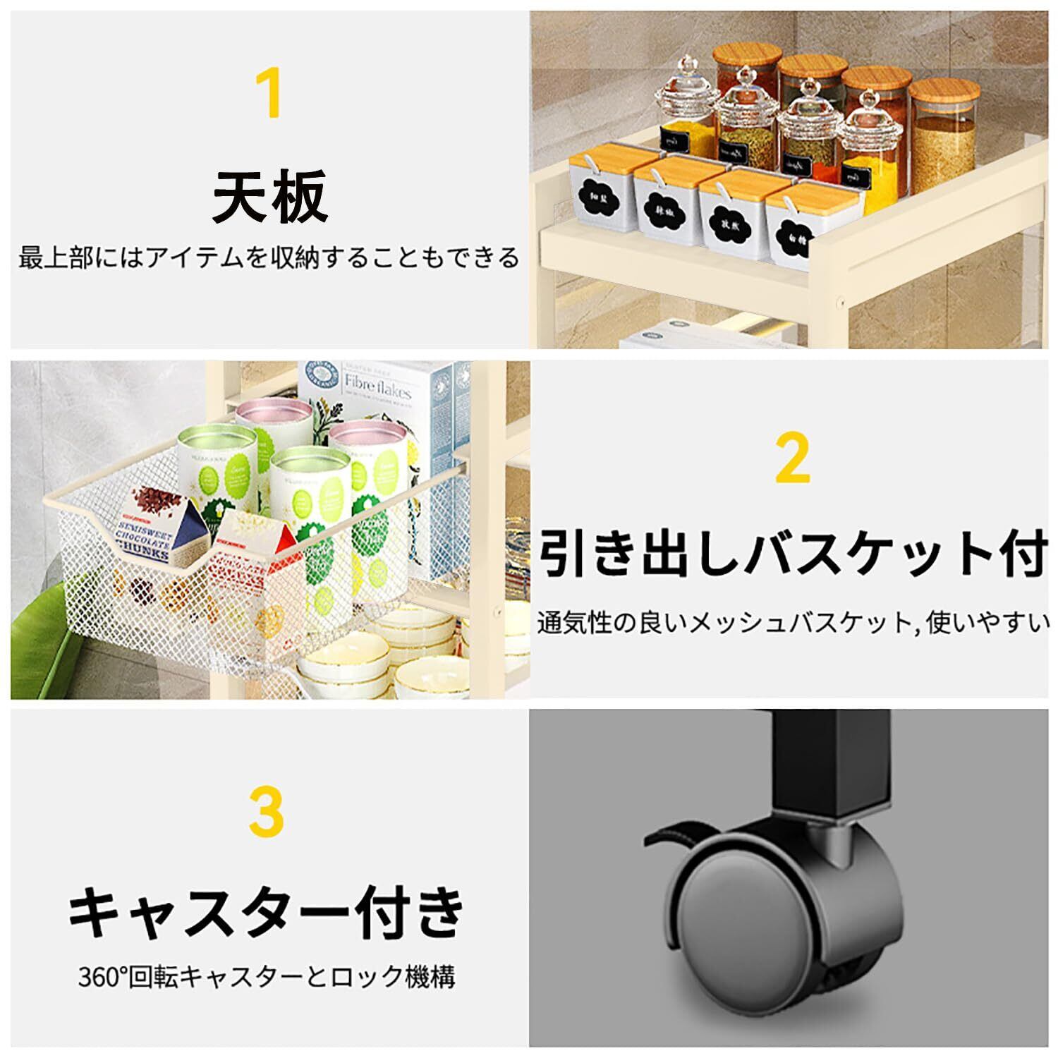使いやすいスライド式: 引出式隙間ワゴンは、①付属の天板は、いつでもサイドテーブルとして使用でき、追加の収納スペースを提供します。②籠下が、メッシュで空気通りが良いながら、保管されているアイテムを視覚的に確認できるため、取り出しやすくなっています。③滑り止め設計で、収納バスケットの端が10cm高くなっており、アイテムの落下を防ぎ、キッチンを清潔に保ちます。