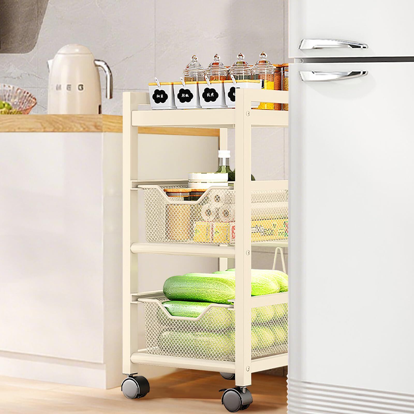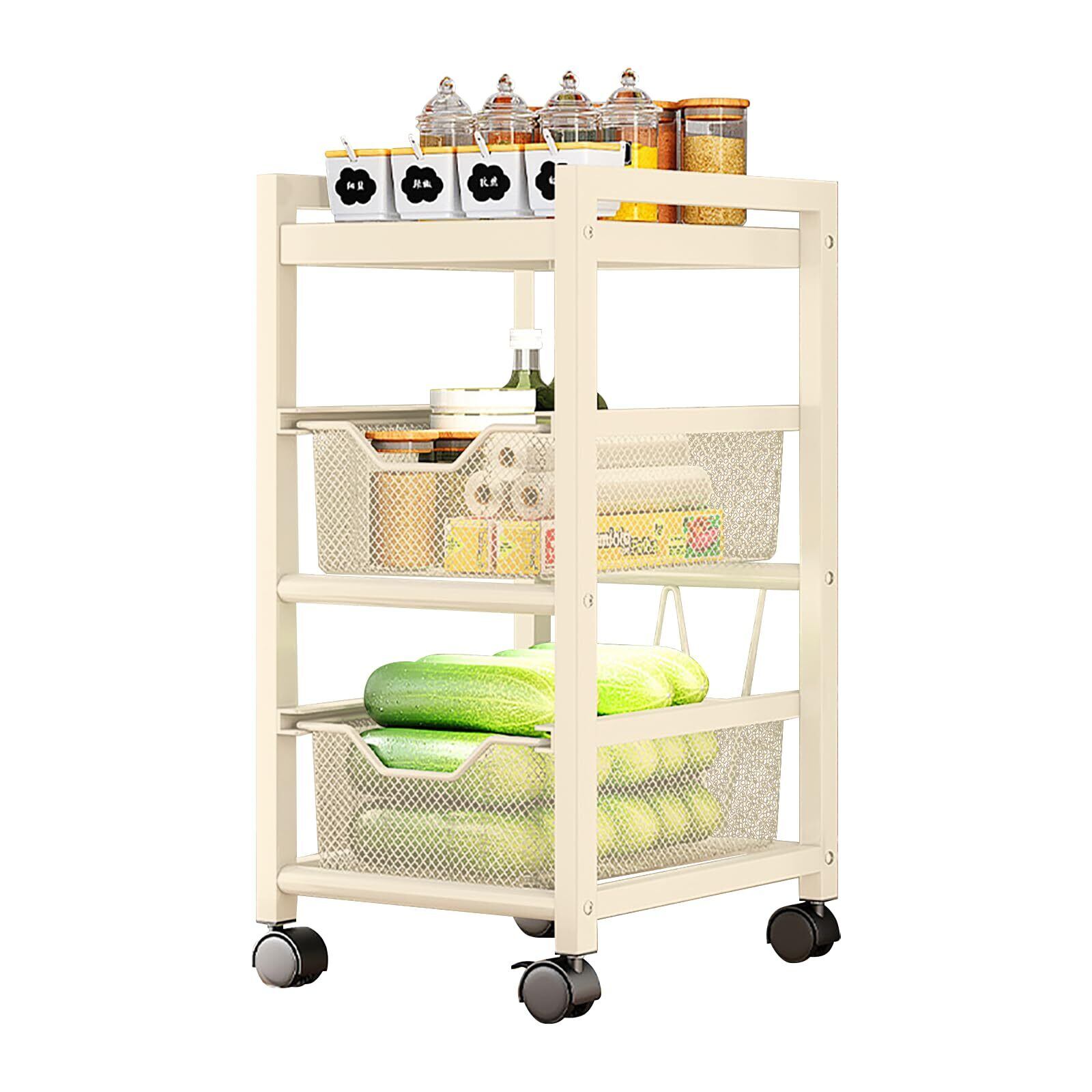 キッチンワゴン 収納カート 引き出し バスケットラック 隙間収納 スライド式 トロリー収納ラック 移動式 キャスター付き 組立簡単 小物 調味料 洗面所 すき間ワゴン 台所 整理棚 (3段 白)