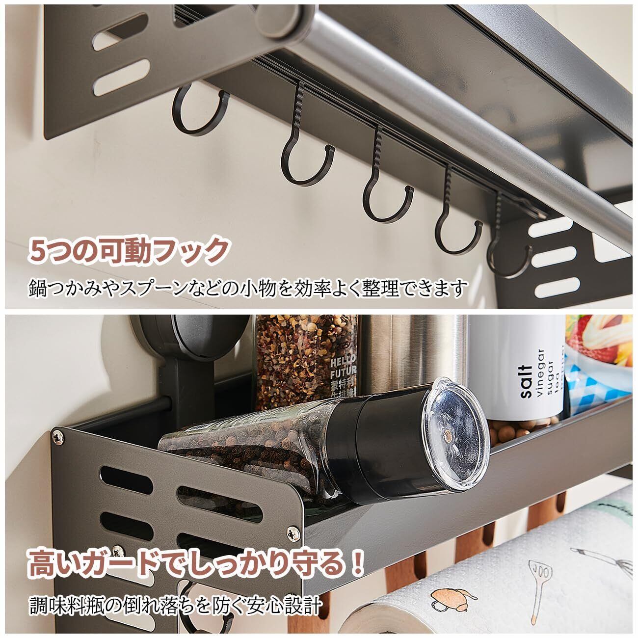 【広幅パネル+5つ可動フック+キッチンペーパーホルダー】 13cmの広々としたパネルは、大きな調味料瓶から小さなスプーンまで余裕を持って収納できる。トレー部分は深いため、調味料などが倒れにくくなっています。5つの可動フックは、鍋つかみやスプーンなどの小物を効率よく整理できます。さらに、取り外し可能な掛け棒でキッチンペーパーや雑巾を簡単に収納できます。