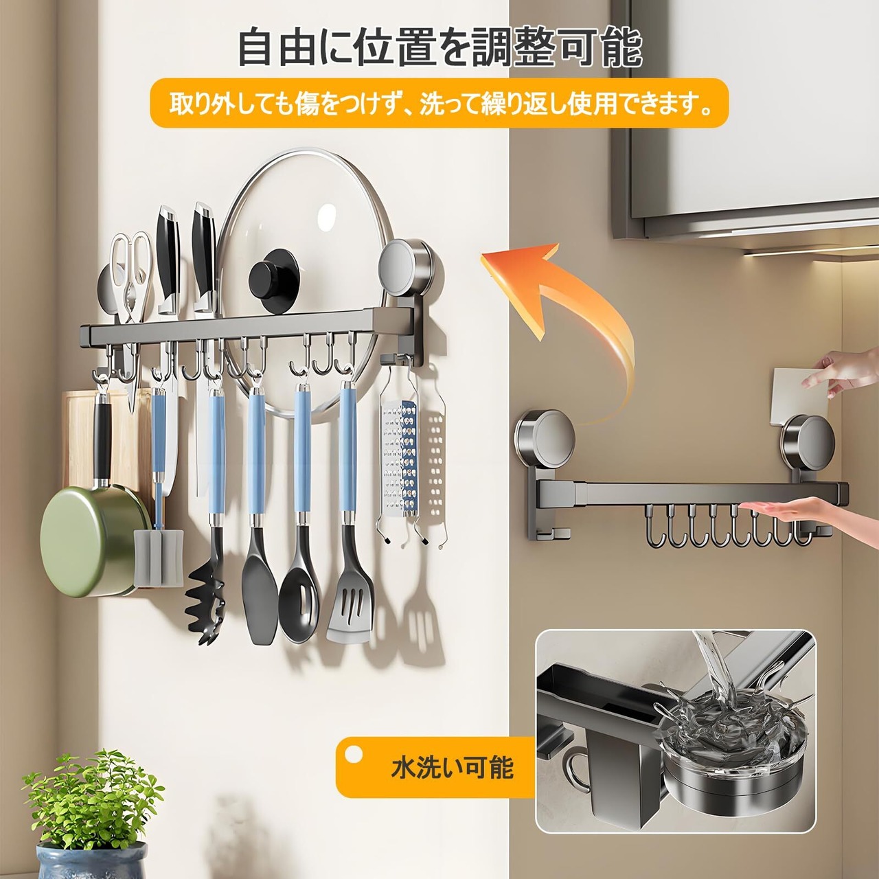 【可動式フック+位置自由】この吸盤フックは移動式で、フックの位置を自由に調整できます。タオル、スポンジ、お玉などのキッチンツールを整理整頓でき、調理器具の効率的な収納をサポートします。フックの数も自由に増減できるので、収納ニーズに応じてカスタマイズが可能です。