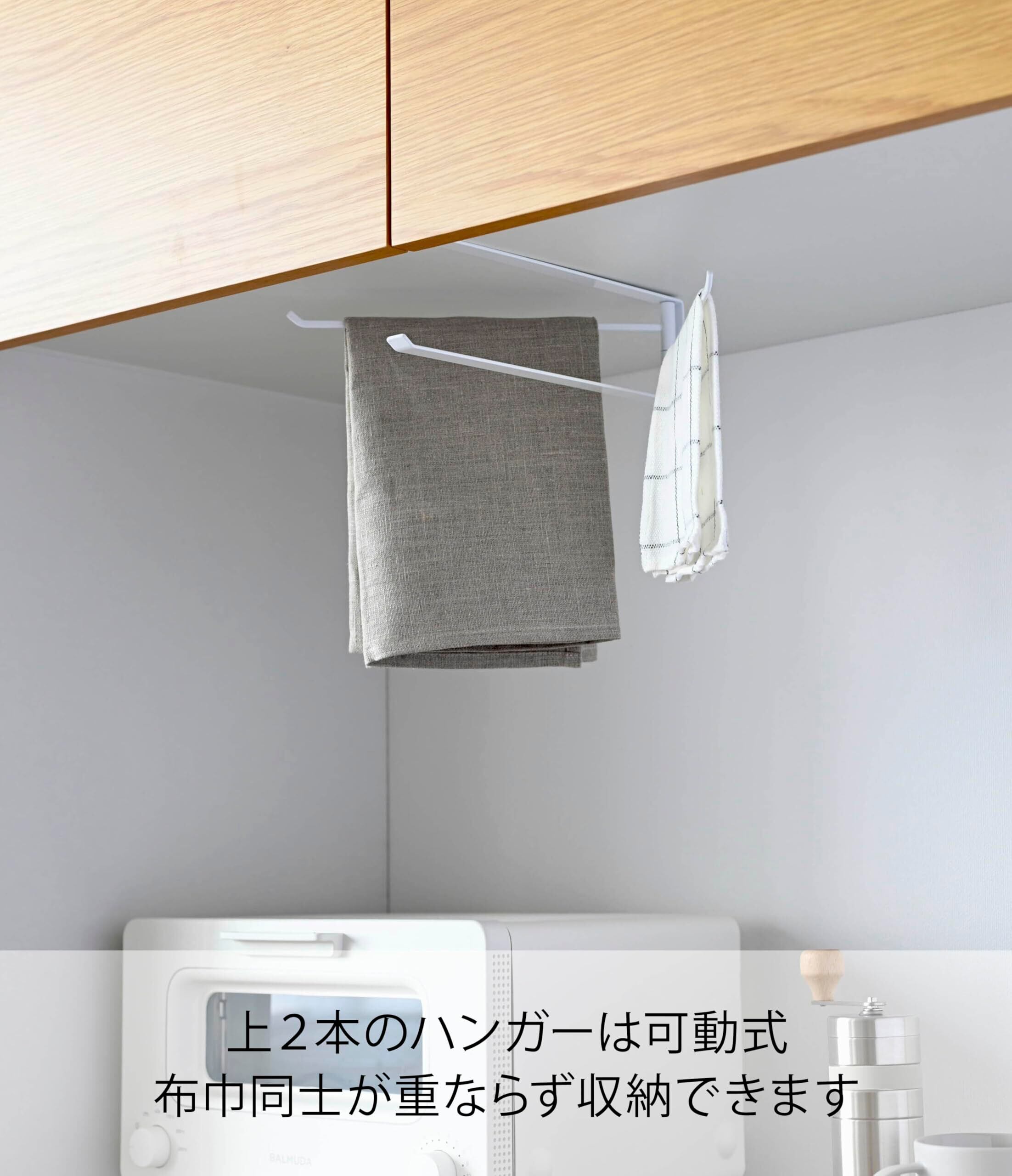 戸棚の下を有効活用!【特長】・吊り下げ戸棚などの下に設置できる布巾ハンガーです。・布巾を3枚掛けられるので、食品用、食材用、手拭き用など使い分けに便利です。・上2本のハンガーはスライドして角度が付けられます。 ・取り付け可能な吊下げ戸棚:底板の厚みが1.4~2cmまで対応。 ・取り付け可能な吊下げ戸棚:底板の厚みが1.4~2cmまで対応。・耐荷重(約):500g