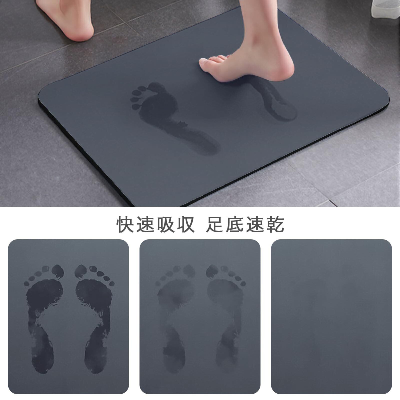 【4層構造】マイクロファイバーテクノロジーファブリック層(テクニカルファブリック、快適な踏み心地)、珪藻透水層(多気孔、第1層は水を吸い込み、水分の浸透を助ける)、珪藻ゴム吸水層(十分に水を吸い込む)、底部ゴム滑り止め層(特殊滑り止め技術は安全をする)があって、使いやすいです。