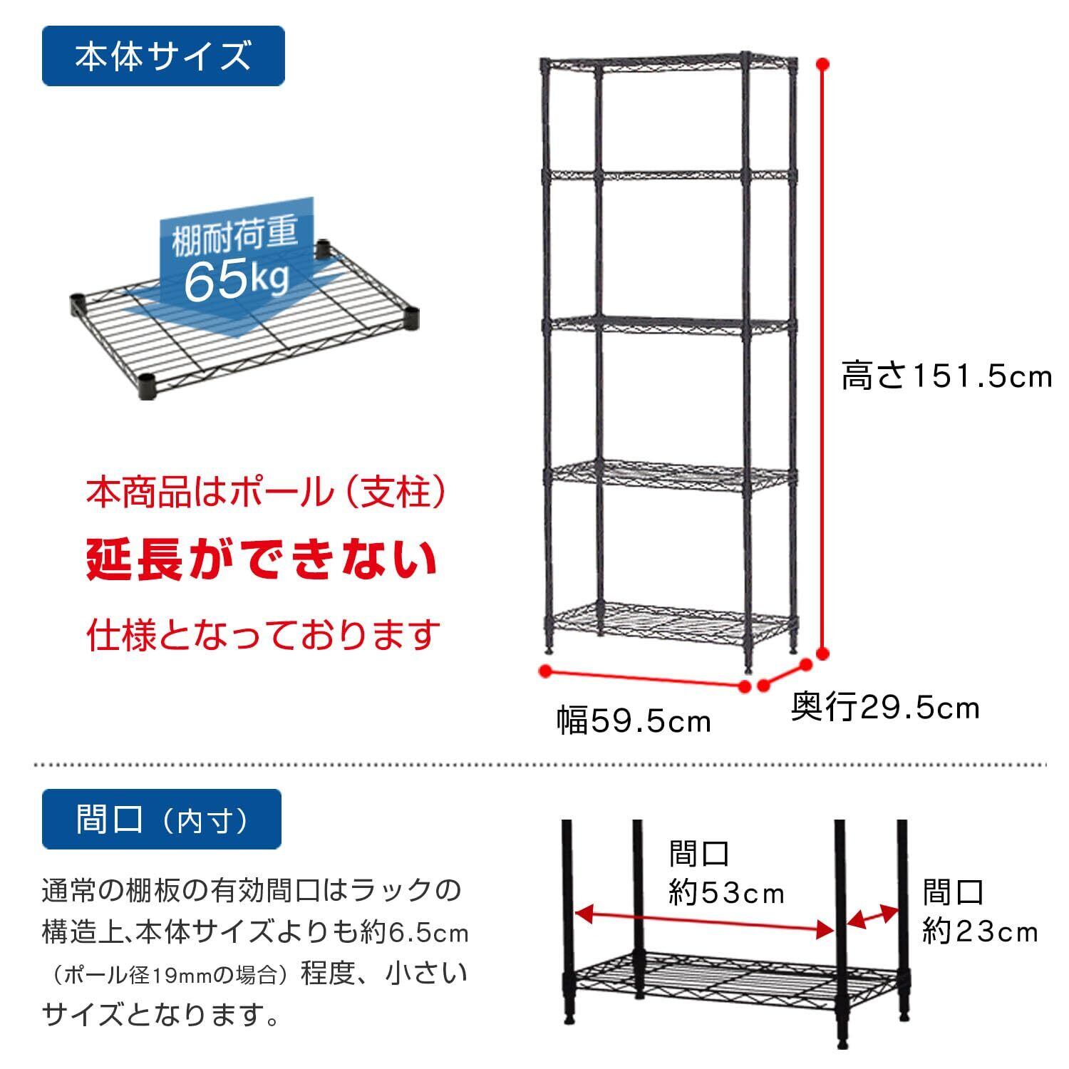 ドウシシャ ルミナス互換 5段 幅60 スリムスチールラック 棚 収納 黒 ブラック 全体耐荷重325kg 幅59.5cm×奥行29.5cm×高さ151.5cm M1560305BK 頑丈 ワイヤーシェルフ 奥行30 ポール径19mm パーツ対応 キッチン ランドリー