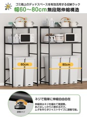 【幅60~80cm伸縮ゴミ箱上ラック】ゴミ箱上の空間を有効活用できる伸縮ゴミ箱上ラック。横幅を約60~80cmの間で調節可能な伸縮式なので、ゴミ箱の数やキッチンスペースに合わせてぴったりサイズで設置できます。省スペースゴミ箱を3つ並べて置ける設計。