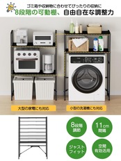 【多機能キッチンラック仕様】サイズ:約幅60~80×奥行き42×高さ125cm(アジャスター含)/可動棚の間隔:約11cm 8段階調整可能/耐荷重:約40kg/材質:スチール(紛体塗装)/製品重量:約9kg デッドスペースになりがちなゴミ箱上の空間を収納スペースに。
