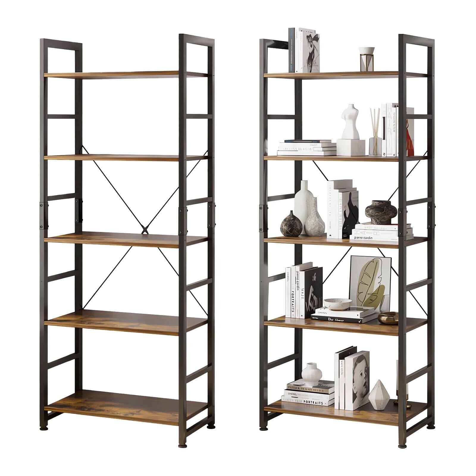Fuwata オープンシェルフラック 本棚 5段本棚 大容量 多機能収納ラック 木製ラック シェルフ 棚 寢室 リビングルーム ホームオフィス (レトロ, 5段)
