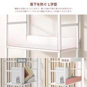 【特別デザイン】2段階で高さ調節可能な布製引き出し付きで、小物や日用品などをすっきり収納可能。収納するものに合わせて引き出しの高さを調節でき、必要に応じて取り外したり折りたたんで収納することもできます。L字構造を採用することで、棚に置いた物が落ちない作りになっています。