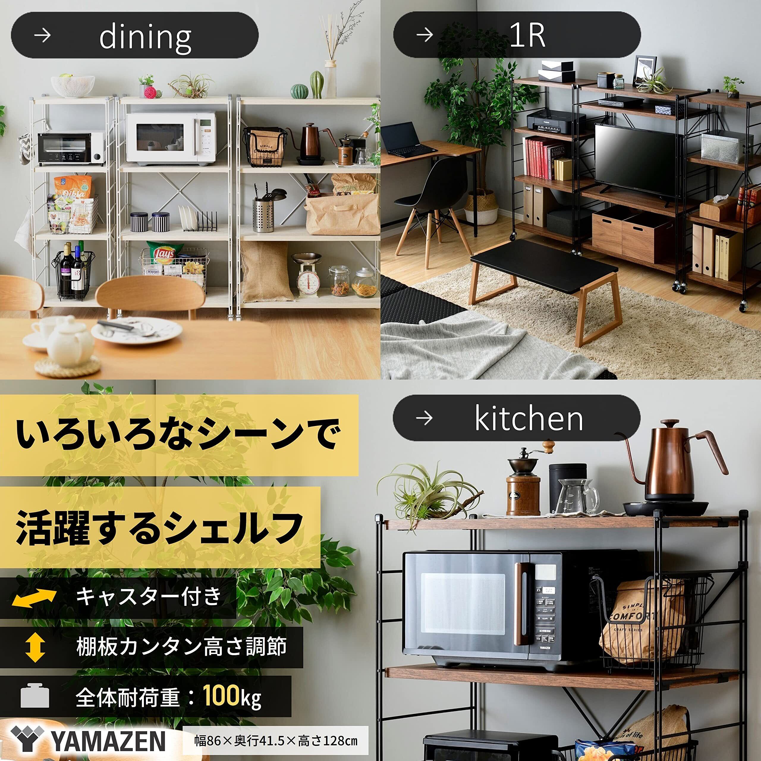 山善(YAMAZEN) ラック (キャスター付き) 【全体耐荷重100㎏】 棚板カンタン高さ調節 幅86×奥行41.5×高さ128㎝ 組立品 ブライトブラウン MWS-12844C(BBR/SBK)