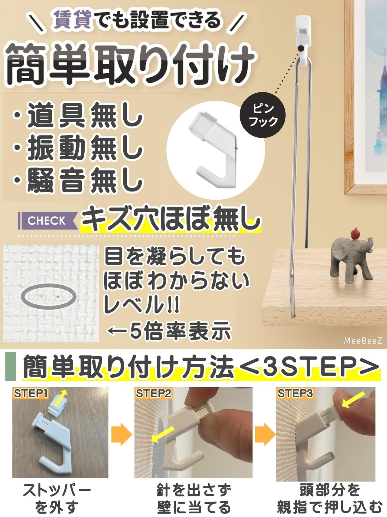 【ピンフックが取り付けられるところ】石こうボード専用 ※裏が空洞であることを必ずご確認ください。コンクリートや木材だとピンが曲がってささりません ※他の材質の場所に取り付けないでください。針が折れたりケガの原因になります。 【ピンフックが取り付けられないところ】柱、かもい、プリント合板、吸音ボード(石こう吸音ボード・ロックウール吸音ボード)、土壁、しっくいなどのもろい壁、コンクリートブロック、レンガ、厚い板などの固い壁、タイルおよびタイルの目地 【類似品にご注意ください!】当店の画像を使って出品している類似品につきまして、ピンフックの針は当店よりも太くキズ穴も大きいため、ご注意いただくようお願い申し上げます。