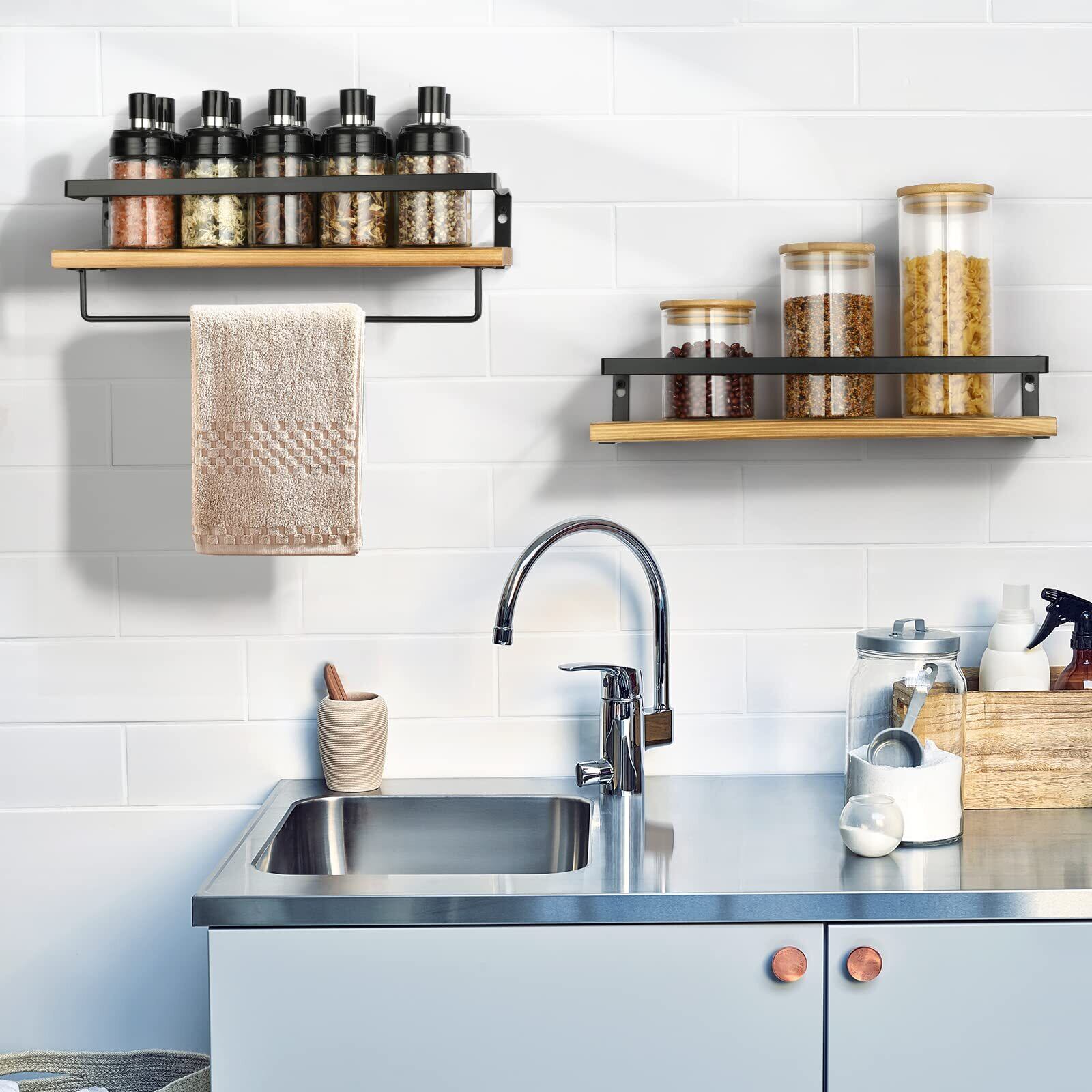 【モダンキッチン壁棚】ブラックメタルスタンドと天然木製壁棚がスタイリッシュでシンプルなキッチンスタイルを演出します。キッチンではウォールシェルフを使って調味料や台所用品の容器を置くことができ、タオルバーはタオルを掛けたり、キッチンフックを使ってキッチン用品を掛けたりすることができます。ウォールシェルフを使用すると、キッチンをよりきれいに、すっきりと整理された感じにすることができます。スタイリッシュな壁美人棚は、ほとんどのデコレーションスタイルとマッチし、キッチンにモダンな美さを添えます。
