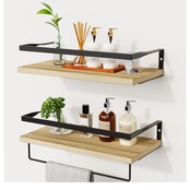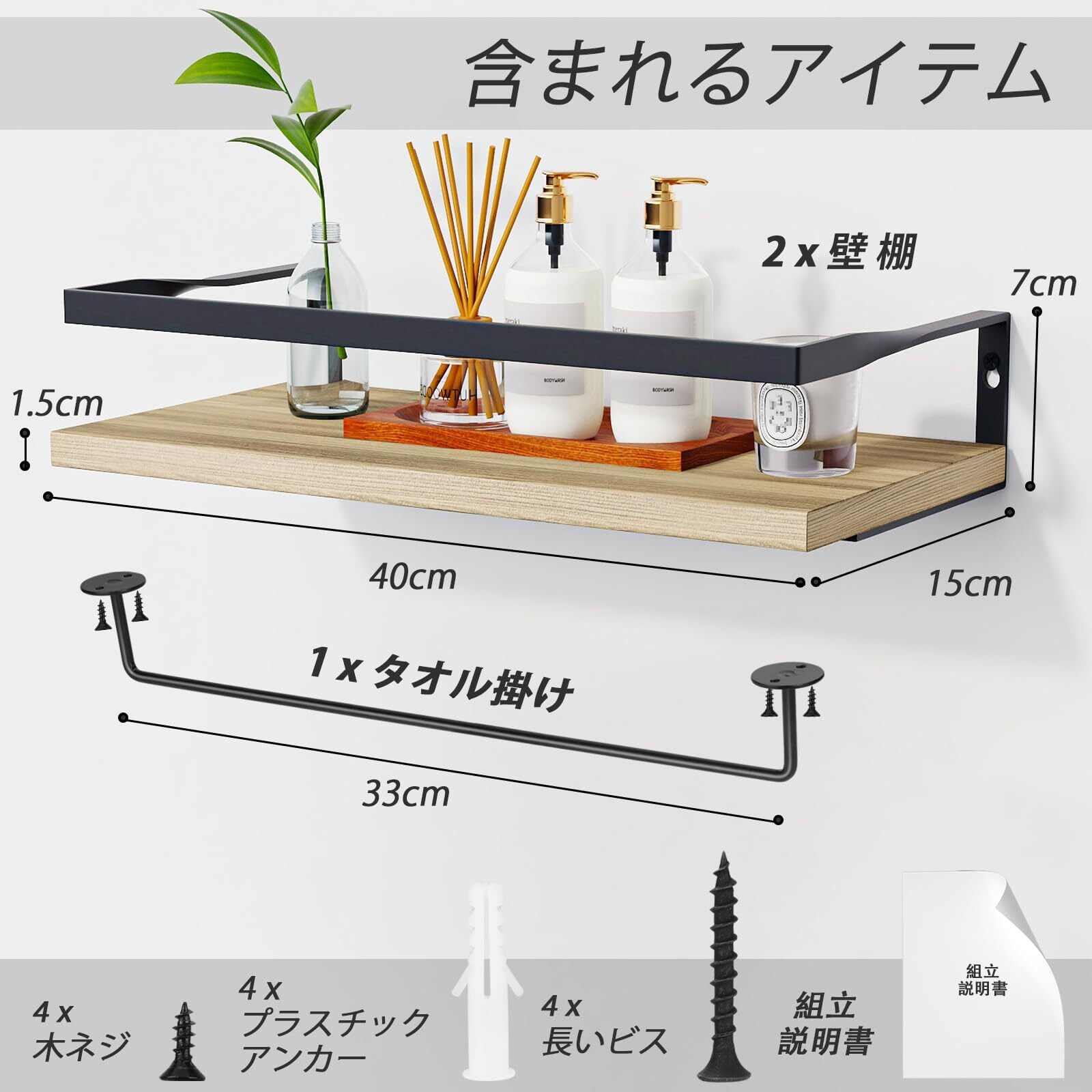 DifferTemp ウォールシェルフ 天然木 壁掛け棚 壁 棚 ウォールラック 壁掛けラック おしゃれ 木製 飾り棚 洗面所 棚 壁掛け 収納 キッチン トイレ 棚 壁面収納 棚付きタオル掛け (明るい木目)